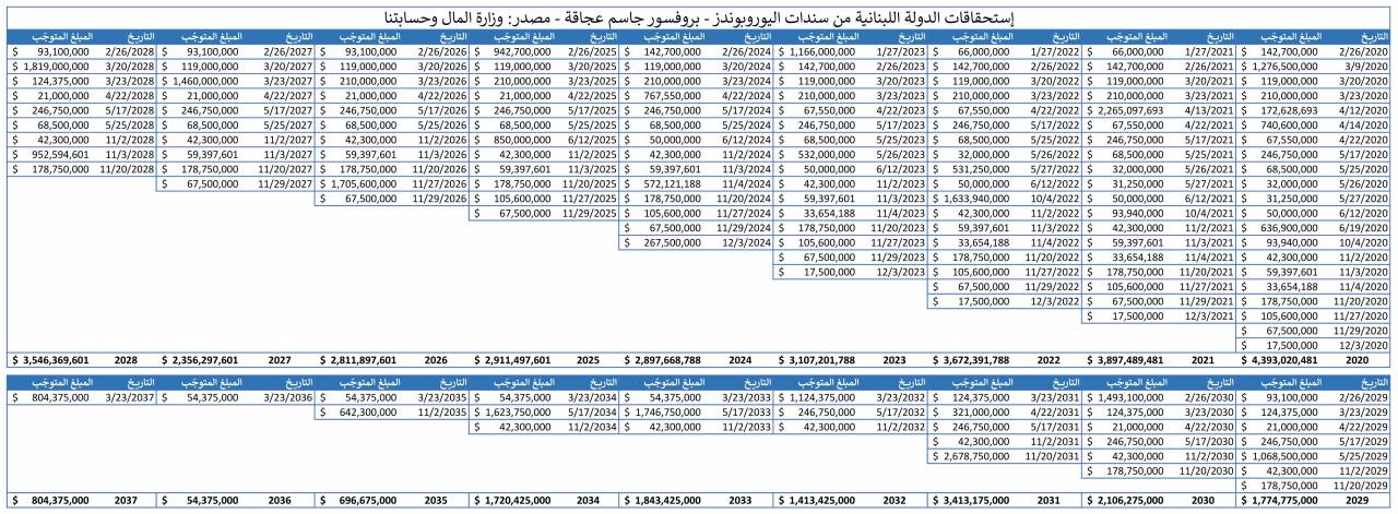 تبلغ قيمة رأس المال المُستدان (بالدولار الأميركي فقط) من قبل الدولة اللبنانية على شكل سندات يوروبوندز ما قيمته 28.314.133.000 دولار أميركي. وإذا ما أخذنا بعين الإعتبار الفوائد على هذا الدين، تُصبح الفاتورة 43.486.759.727 دولار أميركي. هذه الأرقام الصادمة هي نتاج السياسات الحكومة على مرّ السنين والتي أوصلت لبنان إلى الحالة التي هو فيها.