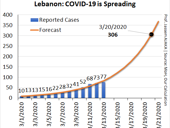 عدد الإصابات المؤكّدة بحسب وزارة الصحّة أصبح حتى البارحة 68 حالة. وبحساب بسيط عبر إستخدام نموذج إسّي (Exponential) والذي يعكس أوّل المنحنى، نجد أن المعطيات لا تُبشر بالخير إذا ما لم يتمّ إتخاذ إجراءات فعّالة لعزل المصابين والمناطق التي تحوي إصابات. وتُشير الحسابات إلى أن عدد الإصابات سيصل إلى 127 حالة في أخر هذا الأسبوع و2554 حالة في أخر هذا الشهر!
