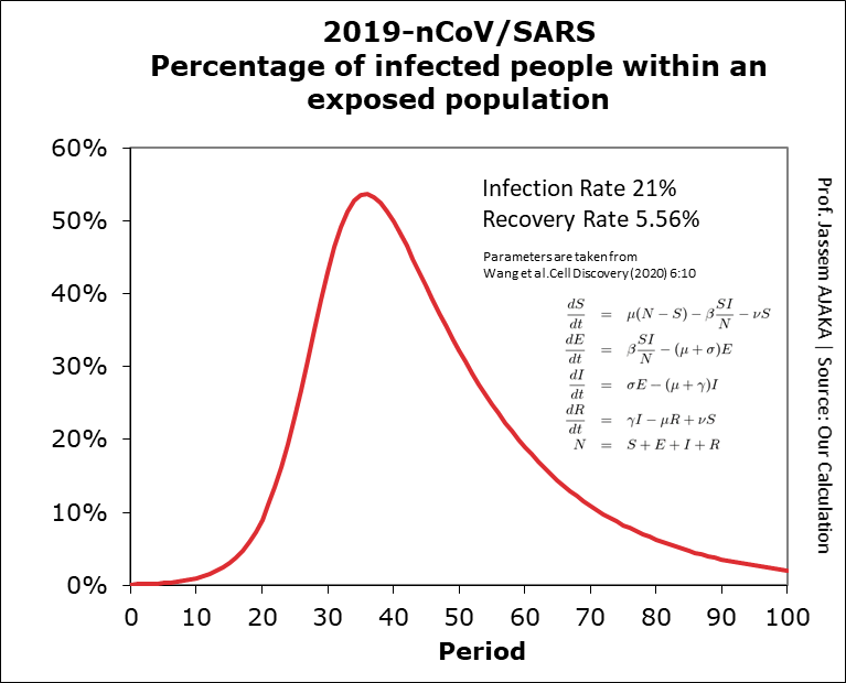 الأوّل – فرضية أن يتمّ إكتشاف علاج لهذا الوباء في الأسابيع والأشهر القادمة حيث ستصلّ نسبة المصابين بالفيروس في لبنان إلى عدّة ألاف (في غياب الإجراءات التي ذكرناها أعلاه) حيث سيصل هذا العدد إلى قمّة قبل أن يبدأ مساره الإنحداري ليختفي بعدها.