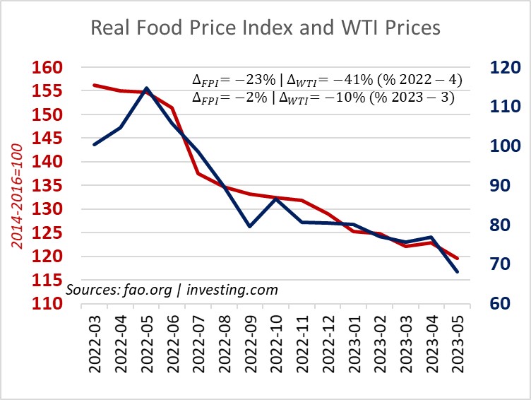 يُشير الموقع الإلكتروني لمنظمة الأغذية العالمية (FAO)، إلى أنّ مؤشر أسعار المواد الغذائية انخفض بنسبة 23% منذ شهر آذار 2022، وهذا الإنخفاض لم ينعكس في الأسواق اللبنانية. أكثر من ذلك، إنخفضت أسعار النفط منذ شهر نيسان 2022 وحتى شهر أيار الماضي بنسبة 41%، وهو ما يعني إنخفاض الكلفة من ناحية النّقل أيضاً، ولكن أيضًا من ناحية الطاقة التي يحتاجها تجار المواد الغذائية لإضاءة المحال وتبريد السّلع التي بحاجة للتبريد. وبالتالي كان من المفروض أن تنخفض الأسعار نتيجة إنخفاض أسعار المواد الغذائية ونتيجة إنخفاض أسعار النفط، إلّا أنّ العكس هو ما حصل على الأرض حيث إرتفعت الأسعار بشكل ملحوظ، ويكفي سؤال المواطن أو النظر إلى مواقع التواصل الاجتماعي للتأكّد من هذا الأمر!