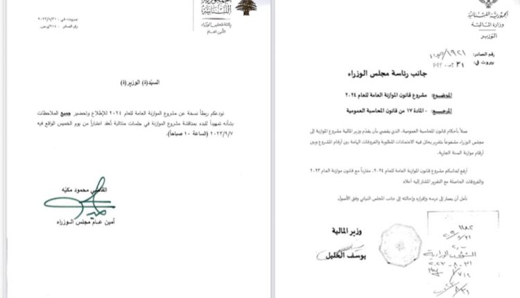 رفع وزير المال يوسف الخليل مشروع موازنة العام 2024 إلى مجلس الوزراء لدراستها وبحثها بهدف إقرارها وإرسالها إلى المجلس النيابي. ويُسجّل لوزير المال رفع موازنة عامّة لأوّل مرّة منذ سنين طويلة في مواعيدها الدستورية، وهو ما يسمحّ أقلّه بمقارنة التقديرات الموضوعة بالموازنة مع ما تمّ تحقيقه على الأرض، وذلك بهدف تصحيح الأخطاء والمساءلة لاحقًا من قبل المجلس النيابي (إذا ما وُجدت).