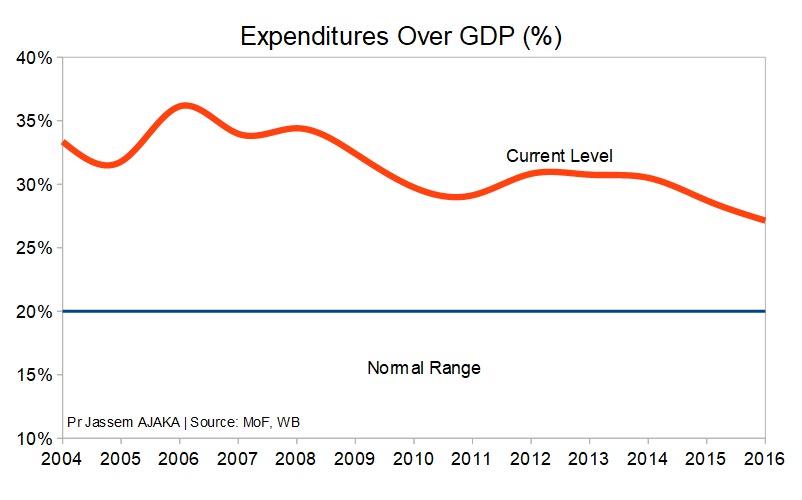 يُشكّل الإنفاق العام اليوم ما يزيد 27% من الناتج المحلّي الإجمالي علمًا بأن المعايير تفرض أن تكون هذه النسبة أقلّ من 20% حيث أن الفرق يجب إستخدامه في تحديث الماكينة الإقتصادية التي وحدها كفيلة بتأمين نموٍ مُستدام.