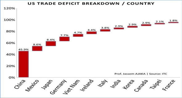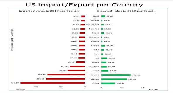 من المعروف أن الولايات المُتحدة الأميركية تُعاني من عجز في ميزانها التجاري بلغ 863 مليار دولار أميركي، في العام 2017، منها 396 مليار دولار أميركي آتية من التبادل التجاري مع الصين، 161 مليار دولار أميركي مع الإتحاد الأوروبي (28)، 74 مليار د.أ مع المكسيك، 72 مليار د.أ مع اليابان… والمُلاحظ أن 12 دولة (الصين، المكسيك، اليابان، ألمانيا، فيتنام، إيرلندا، إيطاليا، الهند، كوريا الجنوبية، كندا، تايبي “الصين”، وفرنسا) هي مسؤولة عن 96% من هذا العجز. من هذا المُنطلق، تأتي إستراتيجية الرئيس الأمريكي، دونالد ترامب، لخفض هذا العجز عبر سياسة حمائية تضرب بعرض الحائط المعاهدات الدولية وحتى إتفاقات مركز التجارة الدولي.
