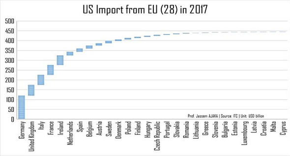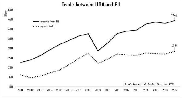 وبنظرة إلى التبادل التجاري بين الولايات المُتحدة الأميركية والإتحاد الأوروبي، نرى أن الولايات المُتحدة الأميركية (عدد سكانها 326 مليون شخص) تستورد من الإتحاد الأوروبي بقيمة 445 مليار د.أ أي ما يوازي 18% من إجمالي صادرات الإتحاد. في حين أن الإتحاد الأوروبي (عدد سكانه 512 مليون شخص) يستورد من الولايات المُتحدة الأميركية بقيمة 284 مليار د.أ أي ما يوازي 12% من استيراد الإتحاد الأوروبي. وعلى رأس قائمة السلع التي يُصدّرها الإتحاد الأوروبي إلى الولايات المُتحدة الأميركية نجد السيارات والمعدّات (24.5%)، المواد الكيميائية (22.4%)، ومعدات النقل (20%). أما على رأس الصادرات الأميركية إلى الإتحاد الأوروبي، فنجد السيارات والمعدّات (27%)، المواد الكيميائية (21%)، ومعدات النقل (17%).
