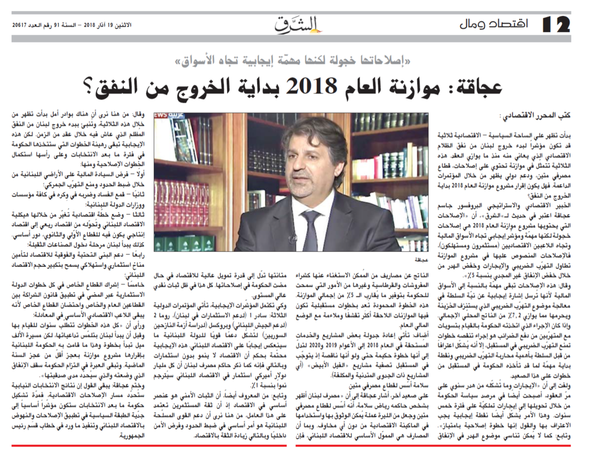 أضاف: تأتي إعادة جدولة بعض المشاريع والخدمات المُستحقة في العام 2018 إلى الأعوام 2019 و2020 لتدلّ إلى أنها خطوة حكيمة حتى ولو أنها ناقصة إذ يتوجّب في المستقبل تصفية مشاريع «الفيل الأبيض» (أي المشاريع ذات الجدوى المتدنية والمكلفة).