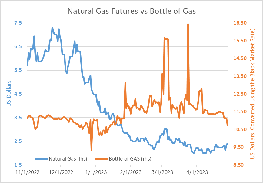 قمنا بالحصول على سعر الغاز في الأسواق العالمية، واستحصلنا على أسعار جرّة الغاز من موقع iptgroup.com.lb وقمنا بتحويل سعر الجرّة إلى دولار أميركي عبر إستخدام سعر السوق الموزاية من موقع lirarate.org. النتائج موضوعة على الرسم المرفق حيث نرى أن سعر الغاز العالمي إنخفض من حدود السبعة دولارات في تشرين الثاني من العام الماضي إلى 2.4 دولار أميركي في أواخر نيسان من هذا العام. في المقابل، نرى أن سعر جرّة الغاز في لبنان بقي مُستقرًا حتى بداية العام الحالي ليرتفع بعدها بشكل ملحوظ إلى مستويات وصلت إلى 16.5 دولار أميركي للجرّة (خلال يوم واحد!) و15.6 دولار أميركي على عدّة أيام.