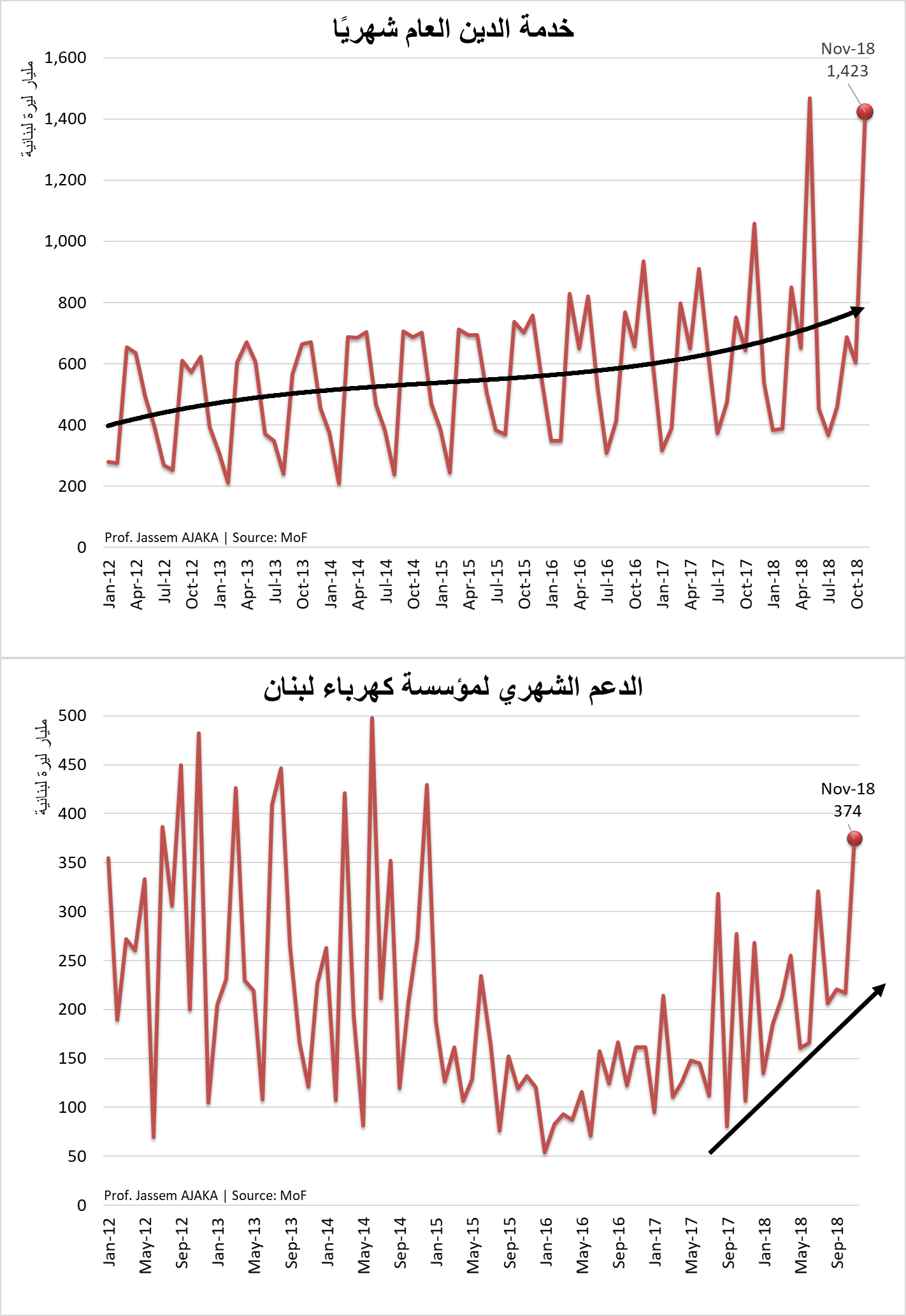 الإنفاق العام ومنذ أيلول 2017، أخذ منحى جديداً مع مُعدّل شهري بقيمة 1.5 مليار دولار أميركي. والملاحظ من خلال أرقام وزارة المال، أنّ خدمة الدين العام ودعم مؤسسة كهرباء لبنان يساهمان بنسبة ملحوظة في هذا الإرتفاع. وإذا كان الإرتفاع في خدمة الدين العام مُبرّراً بزيادة الدين العام وارتفاع الفوائد، إلا أنّ إرتفاع الدعم لمؤسسة كهرباء لبنان، وعلى الرغم من إرتفاع أسعار النفط، لا يُمكن تبريره إلا بأسباب تقنية ناتجة من تآكل المعامل الموجودة، وبالتالي فإنّ إستهلاك الفيول ارتفع.