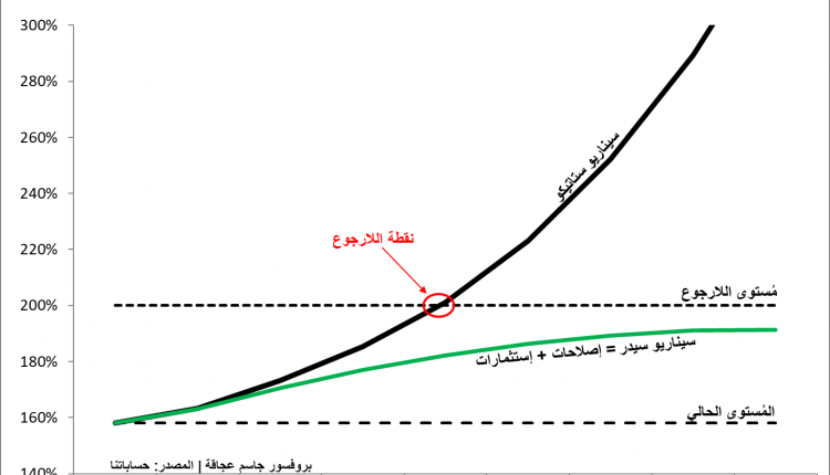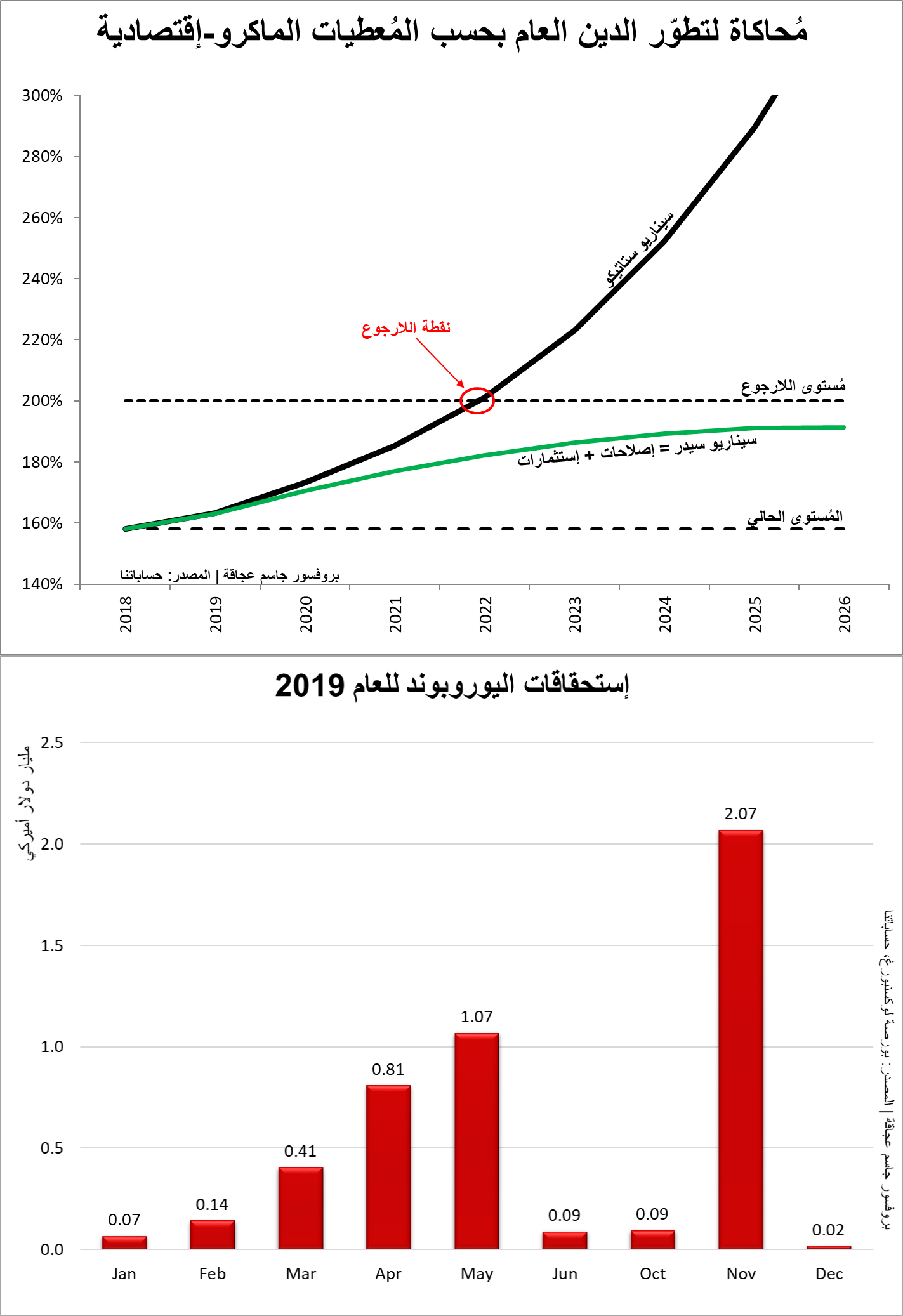 سيناريو الـ9 مليارات دولار أميركي عجز في موازنة العام 2019 هو السيناريو في حال لم يتمّ القيام بأية إجراءات تصحيحية. وبفرضية الإستمرار على نفس النهج، فإنّ موازنة العام 2020 ستحمل عجزًا بقيمة 11 مليار دولار أميركي، ما يعني أنه في العام نفسه، سيكون مستوى الدين العام إلى الناتج المحلّي الإجمالي 200%. هذا السيناريو كارثي ولا يُمكن الإستمرار فيه.