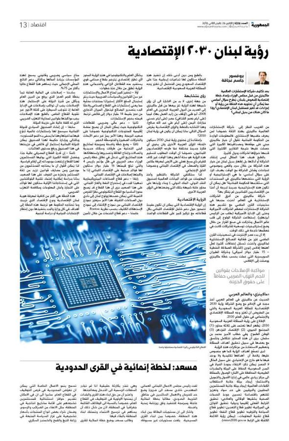 بإعتقادنا إن مُحتوى رؤية لبنان 2030 سيكون «لبّننة» للرؤى العربية الأخرى ولن يحوي أي فكرة جديدة مُختلفة عمّا طرحه الإقتصاديون اللبنانيون، خصوصًا أن الوقت المطلوب لتسليم هذه الرؤية هو ستة أشهر وهذا الوقت غير كاف للقيام بأي مسحّ فعلي على الأرض لمعرفة مكامن القوّة والضعفّ في الإقتصاد اللبناني وخصوصًا الشق الإجتماعي.