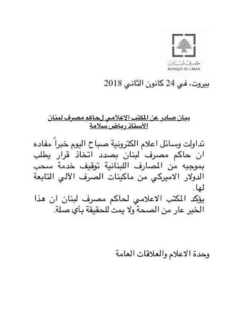 نفى مصدر موثوق به في مصرف لبنان المركزي ما يشاع عن أن حاكم المصرف المركزي سيمنع سحب الدولار من ماكينات الصرف في البنوك.وأوضح في حديث لموقع “الجمهورية” انه لم يصدر قرار حتى الساعة بهذا الخصوص، لافتاً إلى أنّ “ماكينات الصرف هي ملك خاصّ للبنوك التي هي بدورها تعتبر شركات خاصّة، وبالتالي يحق لها وضع العملة التي يرونها مناسبة لهم في ماكيناتهم الخاصّة”.