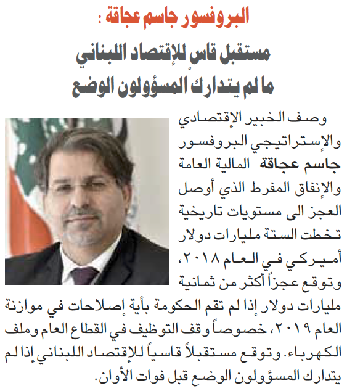 وصف الخبير الإقتصادي والإستراتيجي البروفسور جاسم عجاقة المالية العامة والإنفاق المفرط الذي أوصل العجز الى مستويات تاريخية تخطت الستة مليارات دولار أميركي في العام 2018، وتوقع عجزاً أكثر من ثمانية مليارات دولار إذا لم تقم الحكومة بأية إصلاحات في موازنة العام 2019، خصوصاً وقف التوظيف في القطاع العام وملف الكهرباء. وتوقع مستقبلاً قاسياً للإقتصاد اللبناني إذا لم يتدارك المسؤولون الوضع قبل فوات الأوان.