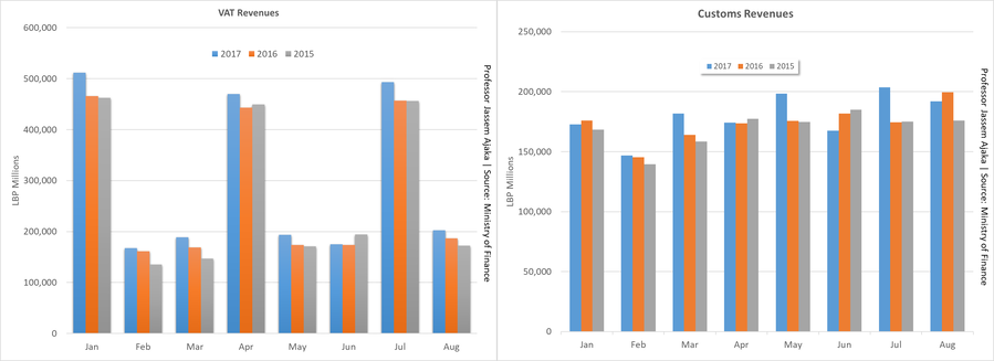 وبالنظر إلى إيرادات الموازنة، نرى أن الإيرادات على الأشهر الثمانية الأولى من العام 2015 بلغت 6.32 مليار دولار أميركي لترتفع إلى 6.44 مليار دولار أميركي في العام 2016 و7.4 مليار دولار أميركي في العام 2017 (على نفس الفترة من العام). وإذا ما نظرنا إلى أسباب هذا الإرتفاع المُلفت في العام 2017، نرى أن الضريبة على القيمة المُضافة كما والإيرادات الجمركية حافظت على نفس المستويات من العام 2015 إلى العام 2017.