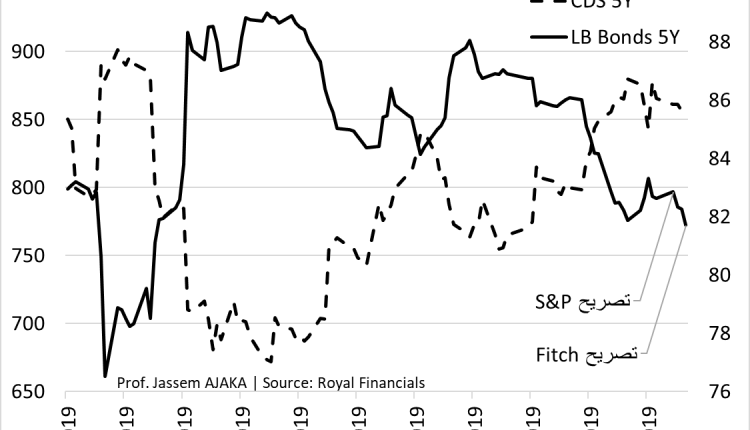 تصاريح وكالات التصنيف الإئتماني (S&P وFitch) لم تمرّ مرور الكرام، فقد تفاعلت الأسواق المالية بشكل فوري مع هذه التصاريح. والمُتضرر الأول كان سندات الخزينة بالدولار الأميركي أو ما يُعرف باليوروبوندز، حيث وبتاريخ 28/5/2019 وعلى إثر صدور بيان وكالة “ستاندرد أند بورز”، إنخفض سعر تداول سندات الخزينة بالدولار الأميركي بشكل فوري من 82.86 نقطة إلى 82.34 نقطة وتابعت إنخفاضها مع صدور تقرير وكالة “فيتش” لتصل إلى 81.71 نقطة البارحة عند الساعة الرابعة بتوقيت بيروت.