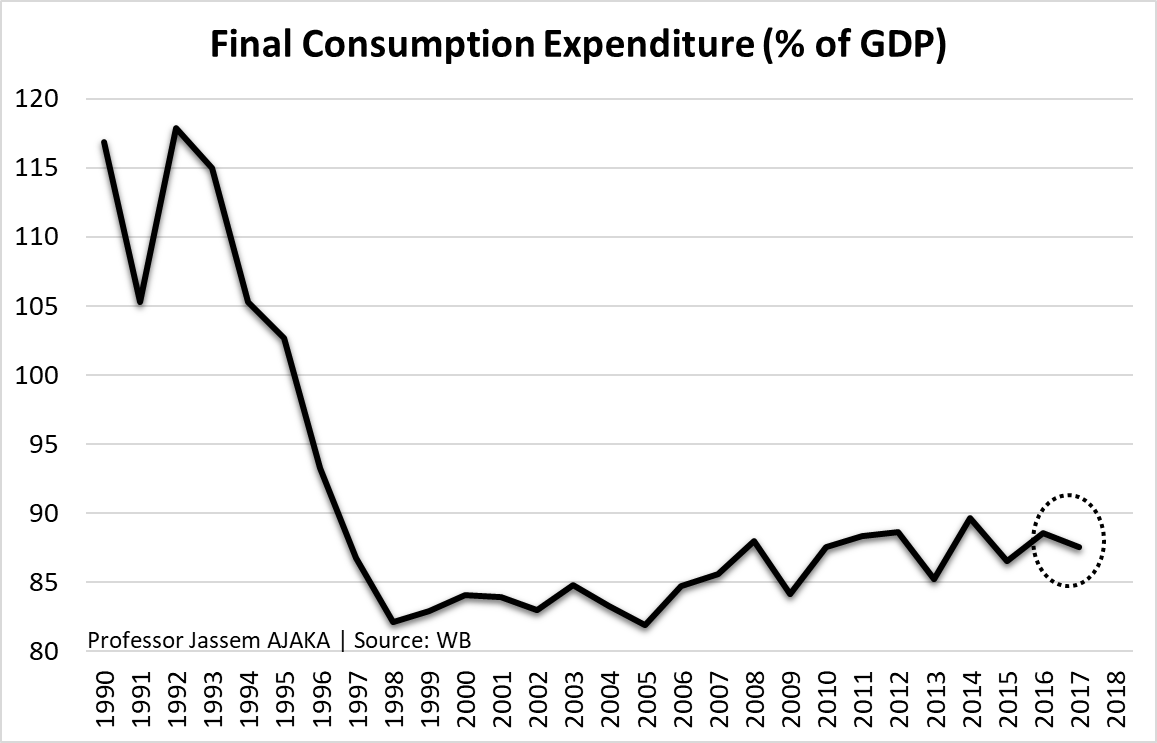 في مقابل ذلك انخفض الاستهلاك بحكم تراجع القوّة الشرائية للمواطن ولكن أيضا نتيجة المخاوف مما دفعه إلى حصر استهلاكه بالأساسيات وكما سبق الذكر، الاستهلاك هو مكوّن أساسي من مكونات الناتج المحلّي الإجمالي.