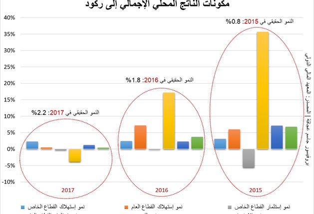 أما في ما يخصّ الإستثمار الخاص فنسبة تراجعه إنخفضت مع الوقت من 5.6% في ال2015 إلى 0.3% في 2017 مما يعني مُساهمة سلبية أقلّ مع الوقت حيث يعود الفضل إلى السياسات النقدية التي تجذب رؤوس الأموال.