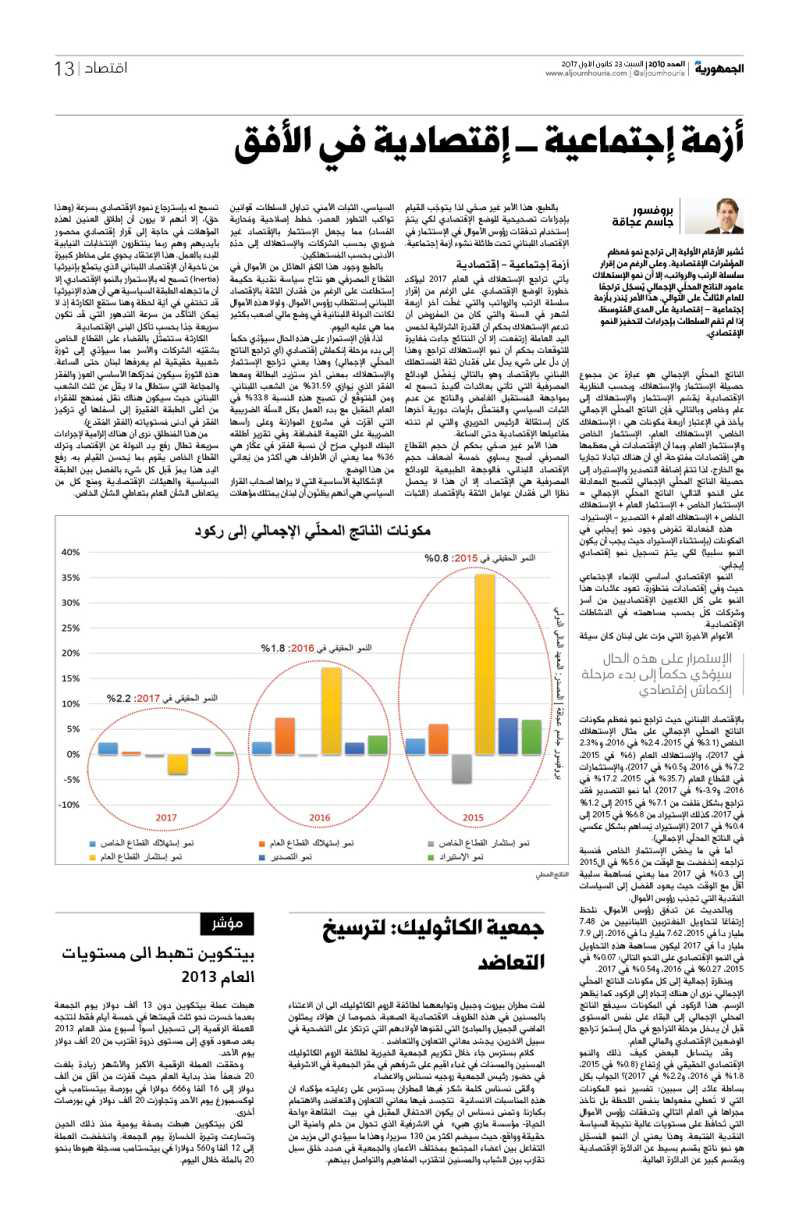 تُشير الأرقام الأولية إلى تراجع نمو مُعظم المؤشرات الإقتصادية. وعلى الرغم من إقرار سلسلة الرتب والرواتب، إلا أن نمو الإستهلاك عامود الناتج المحلّي الإجمالي يُسجّل تراجعًا للعام الثالث على التوالي. هذا الأمر يُنذر بأزمة إجتماعية – إقتصادية على المدى المُتوسطّ، إذا لم تقم السلطات بإجراءات لتحفيز النمو الإقتصادي.