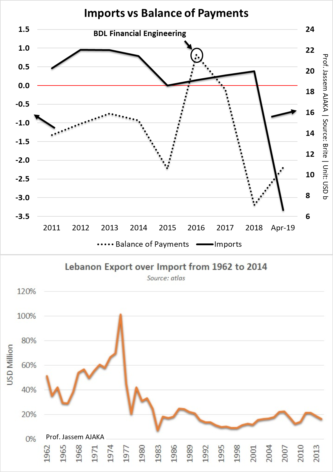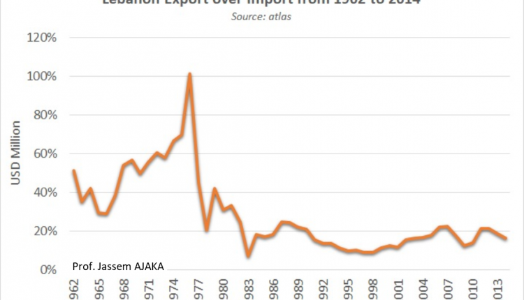 من المعروف أن الدولة اللبنانية لم تُسجّل أي فائض تجاري في تاريخها، فنسبة التصدير إلى الاستيراد لم تتجاوز الـ 67% (الأرقام من الـ 1974 إلى 1976 غير دقيقة). وبالتالي فإن عجز الميزان التجاري هو عجز مزمن. وإذا كان هذا العجز غير مؤذ في الفترة ما قبل العام 2005، إلا أنه أصبح ومنذ العام 2013 يُشكّل خطرًا فعليًا على الكيان اللبناني (اقتصاديا، ماليا ونقديا).