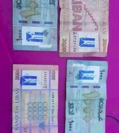 هذه الرسالة تتناقل على هواتف اللبنانيين ووسائل التواصل الإجتماعي مرفقة بصورة تظهر فيها أوراق نقدية من فئة 20 و 5 وألف ليرة عليها ختم كلمة “فلسطين” باللون الأزرق.