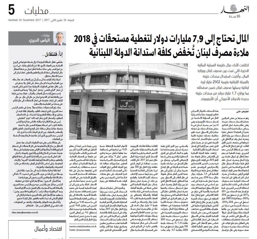المال تحتاج إلى 7.9 مليارات دولار لتغطية مستحقات في 2018 – ملاءة مصرف لبنان تُخفض كلفة استدانة الدولة اللبنانية