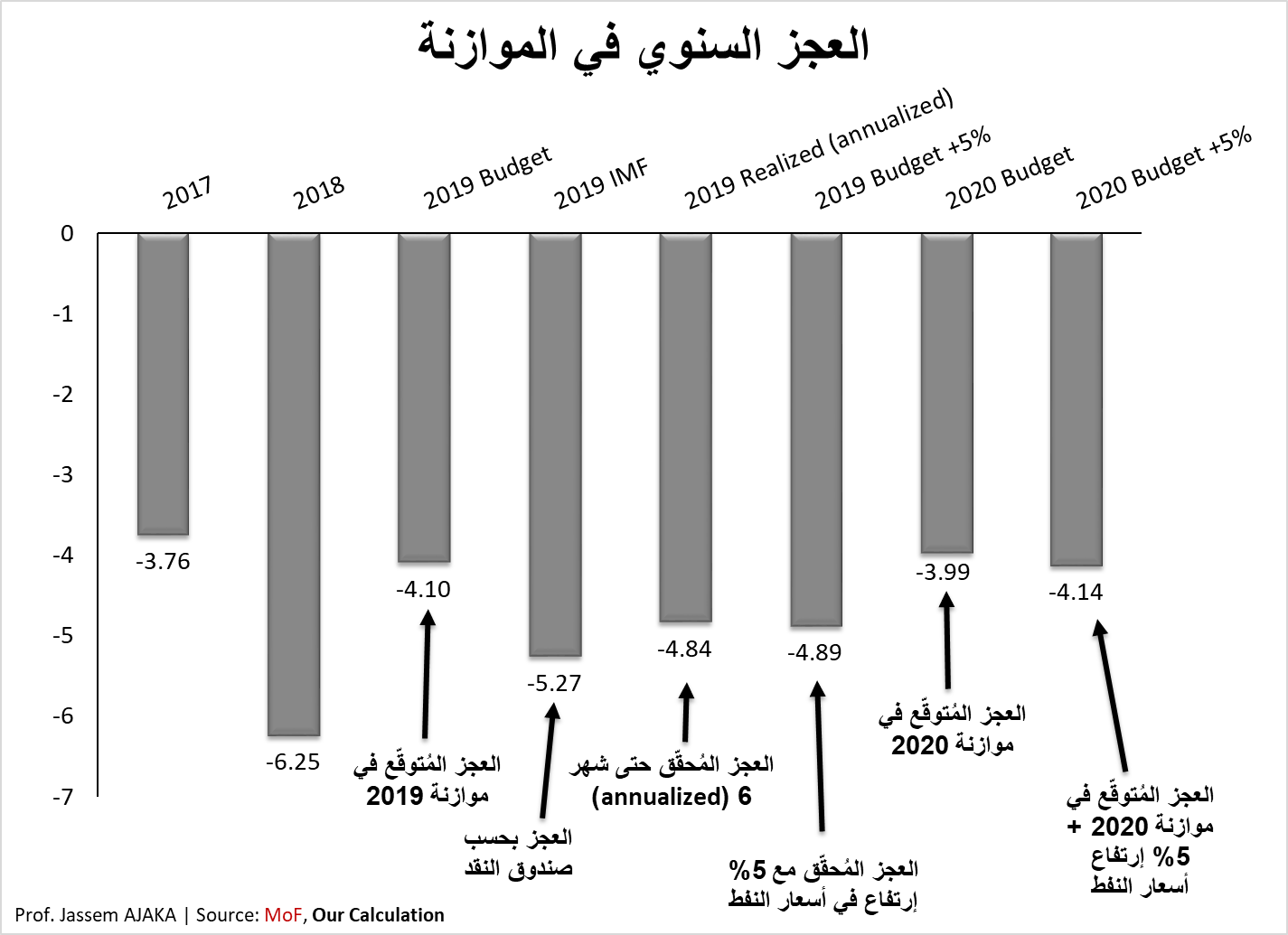 وبإعتبار أن أسعار النفط سجّلت إرتفاعًا بنسبة 5%، فهذا يعني أن العجز سيزداد بقيمة 150 مليون دولار أميركي في الأشهر المتبقية من هذا العام. ليكون بذلك المشهد على النحو التالي: العجز المُتوقّع في موازنة 2019، 4.1 مليار دولار أميركي؛ العجز بموازنة 2019 بحسب صندوق النقد الدولي، 5.27 مليار دولار أميركي؛ العجز المُحقّق حتى شهر حزيران 2019 (annualized)، 4.84 مليار دولار أميركي؛ وإذا ما أضفنا 5% على الفاتورة النفطية على الأشهر المتبقية من العام 2019، يُصبح العجز المُحقّق حتى شهر حزيران 2019 (annualized 4.89 ) مليار دولار أميركي.