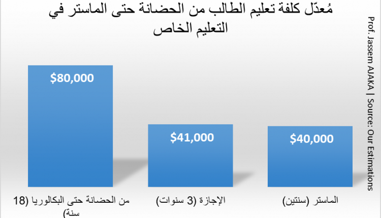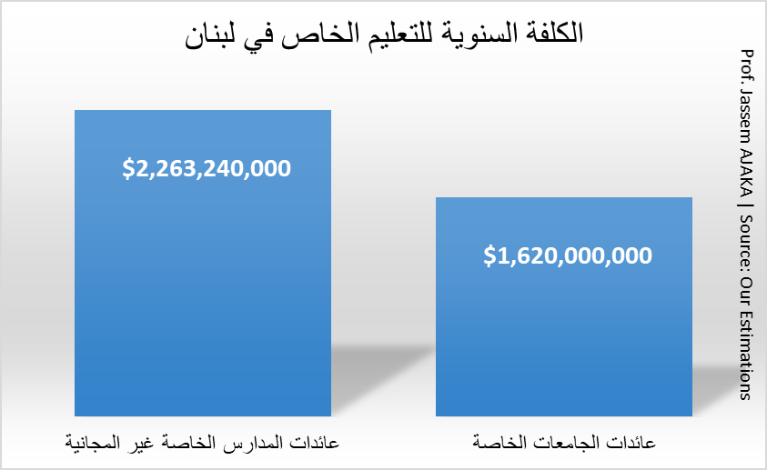 ويُضيف: “كلفة التعليم السنوية تفوق الـ 2.26 مليار دولار أميركي في المدارس الخاصة، أمّا في الجامعات، فتبلغ هذه الكلفة 1.62 مليار دولار أميركي أي ما مجموعه 3.88 مليار دولار أميركي. وإذا ما قسّمنا هذه الكلفة على عدد المدارس الخاصة وعلى عدد الجامعات الخاصة، نجد أن مُعدّل عائدات المدرسة الواحدة يفوق الـ 2.13 مليون دولار أميركي ومُعدّل عائدات الجامعة الواحدة 32.4 مليون دولار”.