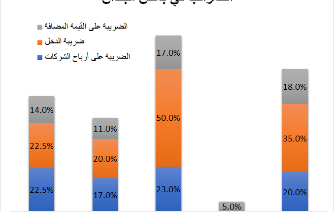 بعض الدول المُحيطة بلبنان تفرض ضرائب عالية وتفوق بمعظمها الضرائب المفروضة في لبنان بإسثناء دولة الإمارات العربية المُتحدّة التي تفرض فقط ضريبة على القيمة المُضافة بنسبة 5% في حين أن إسرائيل تفرض النسب الأعلى مع 50% ضريبة على الدخل، 23% ضريبة على أرباح الشركات و17% ضريبة على القيمة المُضافة. أمّأ في تركيا، فالضريبة على القيمة المُضافة تبلغ 18% مع بعض الإستثناءات، 35% ضريبة على الدخلّ، و20% ضريبة على أرباح الشركات مقارنة بمصر 14% ضريبة على القيمة المُضافة، 22.5% ضريبة على الدخل، و22.5% ضريبة على أرباح الشركات.