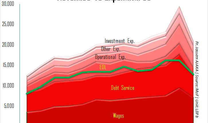 أمّا بند خدّمة الدين العام، فبعد أن كان يناهز الـ 4941 مليار ليرة في العام 2007، إرتفع ليصل إلى 8156 مليار ليرة في العام 2018 ومن المُتوقّع أن لا يقلّ هذا الرقم في العام 2019.