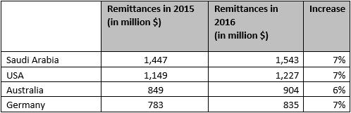 Remittance inflows are expected to reach $7.87 billion this year, up 3.3 percent compared with 2016, according to the World Bank’s Migration and Development Brief.