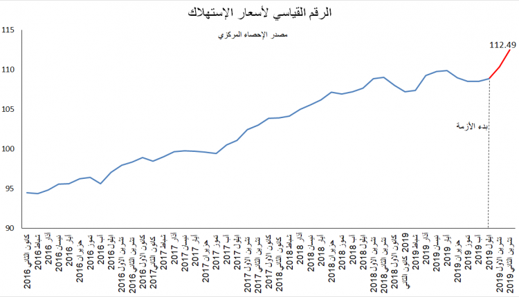 أرقام وزارة الإقتصاد والتجارة المتوافرة على موقعها الإلكتروني لا تُعطي الأسعار إلا للأشهر التي تسبق تشرين الثاني 2019، وبالتالي هذه الأسعار لا تعكس الحقيقة الحالية على الأرض. أمّا أرقام الإحصاء المركزي المتوافرة منذ العام 2007 وحتى شهر تشرين الثاني 2019، تُشير إلى أن هذا المؤشر هو في إرتفاع مُستمر وقدّ سجّل إنعطافًا تصاعديًا ملحوظًا منذ بدء الإحتجاجات الشعبية ووصل إلى مستوى تاريخي في تشرين الثاني 2019 مع 112.49 نقطة. ويعود سبب الإرتفاع هذا إلى الفوضى الواضحة في الأسواق والناتجة عن غياب السلطة التنفيذية.