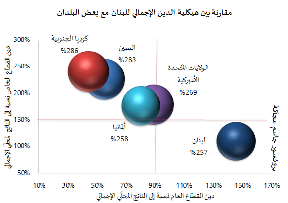 وإذا ما قارنا هيكلية الدين الإجمالي في لبنان مع بعض الدول الأجنبية (أرقام العام 2017) نرى أن حجم الدين الإجمالي كان موازيا تقريباً لحجم معظم الدول (لبنان: 257% من الناتج المحلّي الإجمالي، أميركا: 269%، المانيا: 258%، الصين: 283%، كوريا الجنوبية: 286%)، إلا أن هناك خللاً يُمكن ملاحظته في هيكلية الدين الإجمالي اللبناني. ففي حين أن الدين العام في هذه الدول السابقة الذكر هو تحت عتبة الـ 90% من الناتج المحلّي الإجمالي، نرى أن الدين العام في لبنان تخطى الـ 150%. كما أن قروض القطاع الخاص في هذه الدول تتخطى الـ 150% من الناتج المحلّي الإجمالي في حين أن هذه النسبة في لبنان هي 116% ومعظمها قروض إستهلاكية (أقلّه النصف) وليست إستثمارية للشركات. وعلى هذا الصعيد، يجدر الذكر أن مشكلة الصين الحالية هي مُشكلة معاكسة للبنان من ناحية أن دين الشركات الخاصة عالٍ جداً نسبة إلى الناتج المحلّي الإجمالي ويبلغ ضعف دين الشركات الخاصة في الولايات المُتحدة الأميركية. وكخلاصة، يُمكن الإستنتاج أن المصارف اللبنانية كانت توظّف الأموال بشكل أساسي في الـ repo وسندات الخزينة (See the Income Statement of the Banks). وهذا الأمر أفقدها دورها الإقتصادي وجعلها رهينة الوضع المالي الحكومي السيئ.