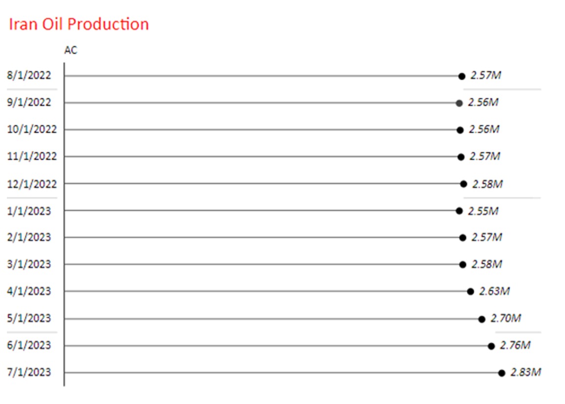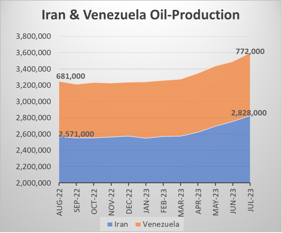 أمّا إذا قامت المملكة وروسيا بخفض إضافي لإنتاجهما، فإنّ أسعار النّفط لن تنخفض وهذا أمر تعرفه إدارة بايدن. لذلك، تقول المعلومات أنّ إدارة بايدن تعمل على خطّ فنزويلا لزيادة إنتاجها من النّفط لنفس الأسباب التي عملت عليها مع إيران. وبالتّالي فإنّ إنتاج فنزويلا من النفط يزداد أيضًا حيث إرتفع من 681 ألف برميل يوميًا في آب 2022 إلى 772 ألف برميل في حزيران 2023 وهو ما يسمح للسوق بإستيعاب ما يفوق المليوني برميل إضافية في النهار (ما بين إيران وفنزويلا) تسمح بتعويض خفض إنتاج المملكة العربية السعودية وروسيا.