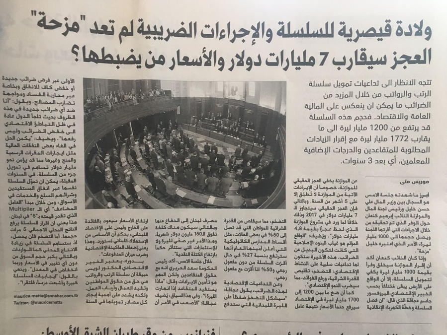 تتجه الانظار الى تداعيات تمويل سلسلة الرتب والرواتب من خلال المزيد من الضرائب ما يمكن ان ينعكس على المالية العامة والاقتصاد. فحجم هذه السلسلة قد يرتفع من 1200 مليار ليرة الى ما يقارب 1772 مليار ليرة مع إقرار الزيادات المطلوبة للمُتقاعدين والدرجات الإضافية للمعلمين، أي بعد 3 سنوات.