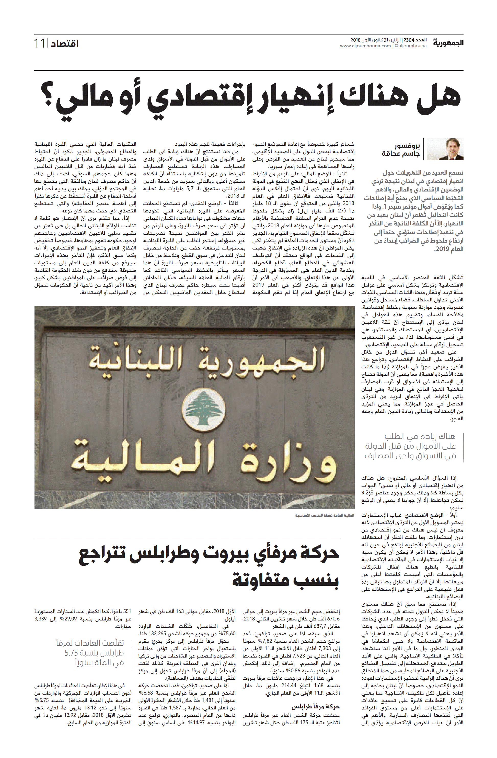 ثانياً – الوضع المالي: على الرغم من الإفراط في الإنفاق الذي يُمثل النهج المُتّبع في الدولة اللبنانية اليوم، نرى أنّ احتمال إفلاس الدوّلة اللبنانية مُستبعد. فالإنفاق العام في العام 2018 والذي من المتوقّع أن يفوق الـ 18 مليار د.أ (27 ألف مليار ل.ل) زاد بشكل ملحوظ نتيجة عدم التزام السلطة التنفيذية بالأرقام المنصوص عليها في موازنة العام 2018، والتي تُشكّل سقفاً للإنفاق المسموح القيام به. الجدير ذكره أنّ مستوى الخدمات العامّة لم يتغيّر لكي يظن المواطن أنّ هذه الزيادة في الإنفاق ذهبت إلى الخدمات. في الواقع نعتقد أنّ التوظيف العشوائي في القطاع العام، قطاع الكهرباء، وخدمة الدين العام هي المسؤولة في الدرجة الأولى عن هذا الإنفاق. والأصعب في الأمر أنّ هذا الواقع قد يتردّى أكثر في العام 2019 مع ارتفاع الإنفاق العام إذا لم تقم الحكومة بإجراءات مُعينة للجم هذه البنود.