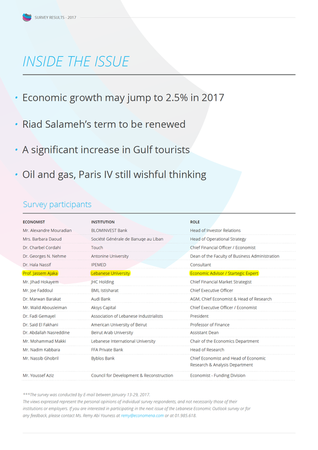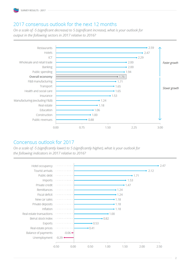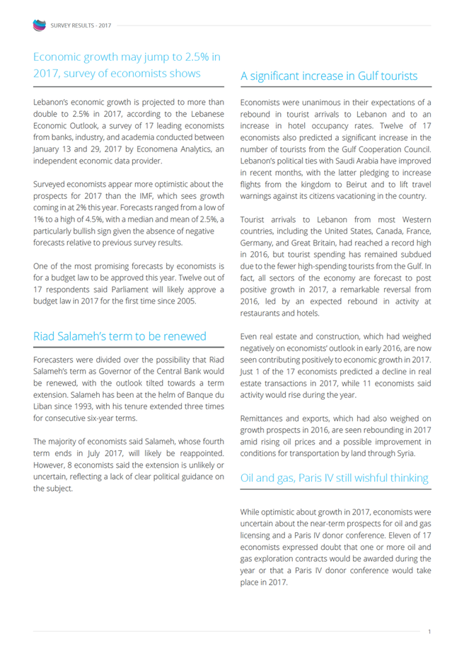 Economic growth may jump to 2.5% in 2017, according to the Lebanese Economic Outlook, a survey of 17 leading Lebanese economists conducted between January 13 and 29, 2017 by Economena Analytics, an independent economic data provider.