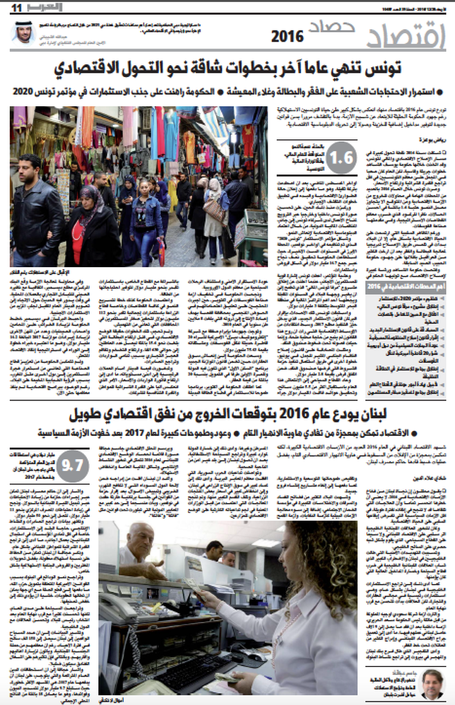 وأدى التفجير الذي طال فرع بنك لبنان والمهجر في بيروت إلى تراجع نشاط البنوك وتقليص طموحاتها التوسعية والاستثمارية، كما دفعها إلى إلغاء مشاريع إنشاء فروع جديدة. وشهدت البلاد الكثير من فضائح الفساد والسرقات والاختلاسات الكبيرة في مؤسسة الضمان الاجتماعي، إضافة إلى سوء معالجة الأزمات البيئية كأزمة النفايات، وأزمة القمح المسرطن وغيرها. وأدى ذلك إلى خسارة الدولة لموارد كبيرة وتراجع السياحة الاستشفائية، بعد أن تحول لبنان إلى بلد غير آمن من الناحية الصحية. وتواصلت تداعيات الحرب السورية، التي أقفلت معظم المعابر البرية. وأدى ذلك إلى كساد كبير في سوق الإنتاج الزراعي في لبنان، وإلى انخفاض كبير في أسعار بعض المنتجات الزراعية، وتلف القسم الكبير منها، ولم تنجح المعالجات التي اعتمدت من قبل الوزارات المعنية في لجم تداعياته الكارثية على الوضع الاقتصادي للمزارعين. ويرسم المحلل الاقتصادي جاسم عجاقة صورة قاتمة لحصاد الوضع الاقتصادي اللبناني لعام 2016 تتمثل في تدهور النشاط الإنتاجي وتآكل المالية العامة وانخفاض الاستهلاك. وأكد أن لبنان أفلت من إدراجه ضمن لائحة الدول السوداء التي لا تكافح التهرب الضريبي وتبييض الأموال، بعد إقرار حزمة من القوانين في جلسة برلمانية طارئة عقدت في نوفمبر، وبات منسجما إلى حد كبير مع المعايير الدولية التي تبلورت تحت قوانين مثل “فاتكا” و“غاتكا”. وأشار إلى أن حاكم مصرف لبنان تمكن عبر إجراءات حازمة من زيادة الاحتياطات عبر تبديل الليرة اللبنانية بالدولار. ونجح في زيادة احتياطات المصرف المركزي بنحو 11 مليار دولار، لتصل إلى نحو 50 مليار دولار. وتظهر بيانات تراجع الصادرات والنشاط الإنتاجي، حاجة البلد إلى الاستثمارات، خاصة في ظل تمادي المؤسسات في استبدال اللبنانيين بعمال أجانب، ما أدى إلى تراجع القدرة الشرائية للمواطن اللبناني بشكل عام. وذكر عجاقة أن لبنان تمكن من الحفاظ على نسبة استهلاك معقولة، بفضل تحويلات المغتربين والقروض البنكية الاستهلاكية بشكل خاص.