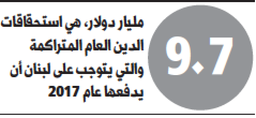 وتراجع نمو الودائع في البنوك بسبب القوانين الأميركية المتعلقة بتمويل حزب الله، ما دفعها إلى قطع الصلة مع أي جهة يمكن أن تطالها العقوبات، خشية أن يؤدي ذلك إلى خفض تصنيفها. وتراجعت السياحة على مدى العام، لكنها تحسنت كثيرا مع قرب نهاية العام بعد انتخاب رئيس للبلاد وتحسن العلاقات مع الدول الخليجية. وتشير البيانات إلى أن عدد السياح الوافدين إلى لبنان سيصل إلى 150 ألف سائح في فترة الأعياد، رغم أن معظمهم من حملة الجنسية اللبنانية، ويأتون لزيارة أهاليهم وأقاربهم، وبالتالي فإن تأثيرهم على أشغال الفنادق سيكون ضئيلا. وأشار عجاقة إلى أن استحقاقات الدين العام المتراكمة والتي يتوجب على لبنان أن يدفعها عام 2017، هي المشهد الأكثر خطورة، حيث ستبلغ 9.7 مليار دولار لتسديد الديون وفوائدها، وهو ما يعادل 18 بالمئة من الناتج المحلي الإجمالي.