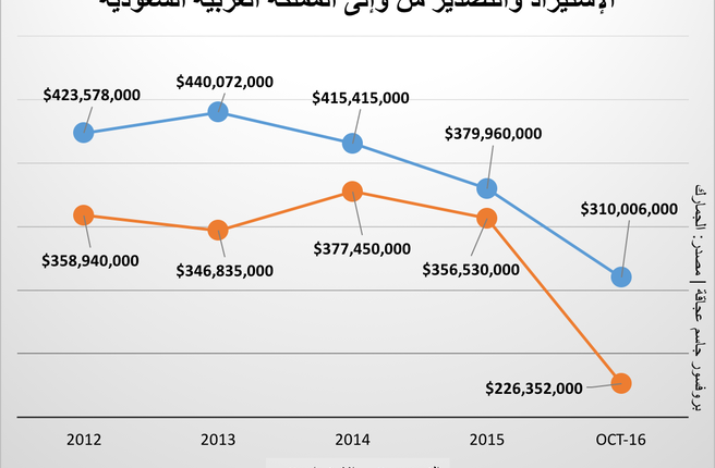 وبلغت قيمة الإستيراد اللبناني من المملكة 423 مليون د.أ في العام 2012، 440 في العام 2013، 415 في العام 2014، 380 في العام 2015 و310 في الأشهر العشرة الأولى من العام الحالي. أما على عصيد التصدير، فبلغت قيمة الصادرات اللبنانية إلى المملكة 359 مليون د.أ في العام 2012، 346 في الـ 2013، 377 في الـ 2014، 356 في الـ 2015 و226 في الأشهر العشرة الأولى من هذا العام. والنظر إلى هذه الأرقام، يُظهر الضعف النسبّي للتبادل التجاري نظرًا إلى هيكلية الإقتصادين السعودي واللبناني.