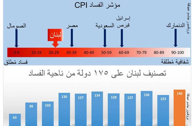 يحتلّ لبنان المرتبة ١٢٣ من أصل ١٧٥ على لائحة الفساد ويأتي بذلك أمام الصومال وخلف مصر والسعودية وإسرائيل وقبرص. بالطبع هذا التصنيف سيّئ لأنه يضرّ بالإقتصاد خصوصاً الإستثمارات الأجنبية المُباشرة التي تخشى الفساد.