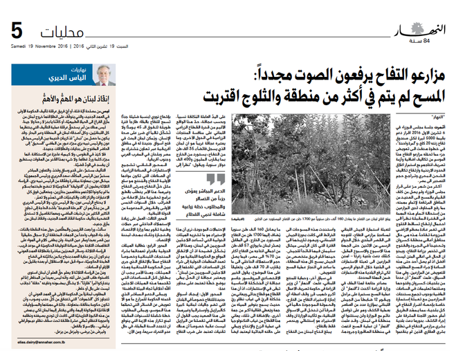 مصادر متابعة لهذا الملف في وزارة الزراعة أكدت لـ”النهار” أن عملية المسح مستمرة على مراحل ويقوم 12 ضابطاً من الجيش اللبناني بمؤازرة عدد من العناصر بعملية الكشف وهم على تواصل دائم مع الوزارة ولن يستثنوا اي منطقة في لبنان. وقد علمت “النهار” ان عملية المسح انتهت في منطقة العاقورة وجرودها، واستندت هذه المسوحات الى الخرائط التي كانت بحوزة الجيش اللبناني، ويعود تاريخها الى الفترة التي كان الرئيس ميشال سليمان فيها قائداً للجيش. حينها قام فريق متخصص من الجيش بمسح كل هذه المنطقة، ما ساعد في اتنجاز عملية المسح للتعويض.