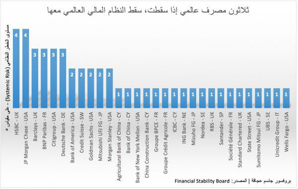 وقد قام مجلس الثبات المالي (Financial Stability Board) المُنبثق عن مجموعة العشرين بوضع لائحة تصنيف بالمصارف التي تُسمّى “Too big to fail” أي حجمها كبير لكي يُسمح لها بالإفلاس. والتصنيف يأخذ بعين الإعتبار الضرر على النظام المالي العالمي ووُضع مقياس على خمسة حيث يُشكل الرقم الأقل خطرًا و الأكثر خطرًا.
