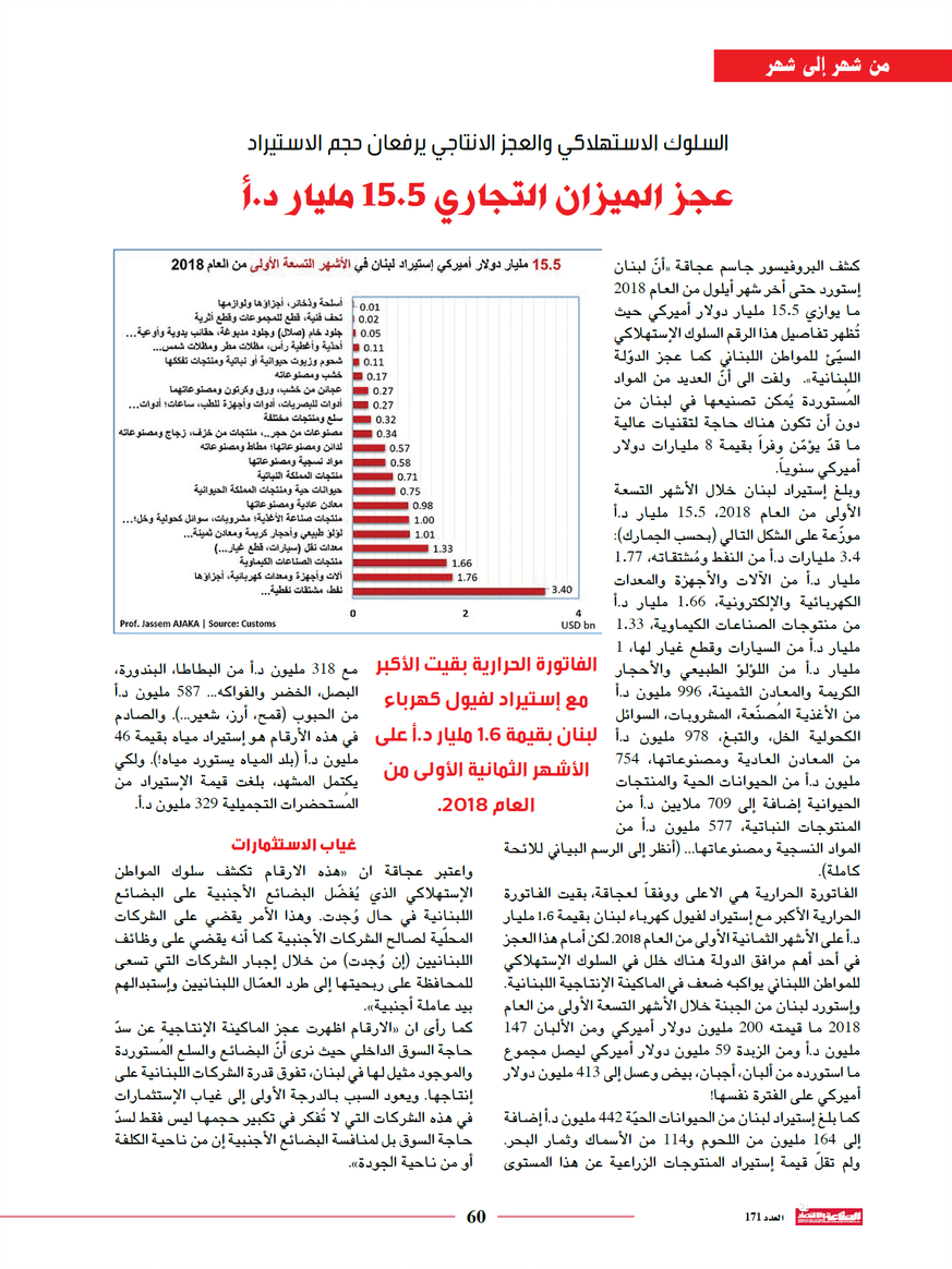 كشف البروفيسور جاسم عجاقة “أنّ لبنان إستورد حتى أخر شهر أيلول من العام 2018 ما يوازي 15.5 مليار دولار أميركي حيث تُظهر تفاصيل هذا الرقم السلوك الإستهلاكي السيّئ للمواطن اللبناني كما عجز الدوّلة اللبنانية”. ولفت الى أنّ العديد من المواد المُستوردة يُمكن تصنيعها في لبنان من دون أن تكون هناك حاجة لتقنيات عالية ما قدّ يؤمّن وفراً بقيمة 8 مليارات دولار أميركي سنوياً.
