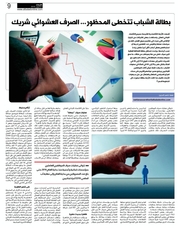 قصفت الأزمة الاقتصادية الشرسة صميم الاقتصاد اللبناني الهش، واستفادت بعض الشركات من شرارة الإفلاس التي سرت في هشيم سوق العمل، لتعديل سياسات عملها وتقليص عدد العاملين لديها أو استبدالهم بعمال أجانب أقل أجراً مقابل زيادة نسب أرباحها. وراحت تستغل مظلة الضائقة المالية لتبرر صرف عاملٍ من هنا وموظفٍ من هناك، ما صنع صنيعه بمعدلات البطالة التي تخطت المحظور مع تقديرات تشير إلى معدلات تفوق الـ37 إلى 38 في المئة بشكل عام، و55 إلى 60 في المئة في صفوف الشباب، ما يهدد لقمة عيش آلاف المواطنين اللبنانيين ويضع مصير عيشهم الكريم على محك المزاج السياسي المتعكر والمتعثّر عن حل بديهيات الأزمات فكيف إذا كانت الأزمة بطالة تجاوزت كل الخطوط الحمر؟! تتوالى عمليات صرف الموظفين العاملين بمؤسسات لبنانية وأجنبية منذ بداية العام 2016 حتى بلغ عدد المصروفين من بداية العام وإلى نهاية آب الماضي 2210 أجراء لبنانيين، حسب أرقام وزارة العمل .أما الأسباب فتعود إلى تعثر هذه المؤسسات اقتصادياً، وتكبدها خسائر مالية. وطالت عمليات الصرف تلك عاملين في مؤسسات عاملة بقطاعات مختلفة (تجارة، صناعة، منظمات وهيئات دولية، صحف، مطاعم، مستشفيات، وشركات خدمات). فصرفت بعض المؤسسات 762 أجيرا لسبب صعوبة آداء عملها في بعض المناطق، وأخرى صرفت 590 أجيرا، فيما صرفت مؤسسات اخرى موظفين وعاملين لبنانيين واستبدلتهم بآخرين أقل أجراً، تحديداً من الأجانب. ولم تقتصر عمليات الصرف على الفردية فصرفت بعض المؤسسات كامل أجرائها في نيسان الماضي والبالغ عددهم 247 أجيرا، لعدم تجديد عقود عمل معها. كما أن بعض الجمعيات والهيئات الدولية صرفت أكثر من 100 أجير وأخرى 31 أجيرا وثالثة 41 أجيرا، لعدّم توفر التمويل لبرامج عملها. والملفت أن وتيرة الصرف تلك من بداية العام وحتى مطلع أيلول لم تتراجع. وبحسب وزارة العمل الأسباب عديدة، منها: مزاحمة اليد العاملة السورية النازحة لليد العاملة اللبنانية في مختلف القطاعات. والأزمة السياسية الضاغطة على الوضع الاقتصادي، منها استمرار الشغور الرئاسي، الأزمة الحكومية، والصراع بين القوى السياسية والانقسامات المتحركة على إيقاع الخلافات الإقليمية. هذا بغض النظر عن تعذر بعض الشركات عن أداء مهامها على الأرض لأسباب أمنية. وتسير الأزمة، وعلى ما يبدو، نحو مزيد من التأزّم، وتستمر حتى كتابة هذه السطور عمليات صرف الأجراء من مؤسسات عدة في لبنان، ويؤخذ على بعض المؤسسات بحسب الوزارة القفز على الخطوة الأخيرة وهي صرف الأجير قبل اعتماد أي سياسة إدارية تنظيمية. علماً أن مؤسسات عديدة مرشحة لاتخاذ خطوات مماثلة، ما يرفع منسوب البطالة في لبنان ويهدد لقمة عيش آلاف اللبنانيين، ويؤثر سلباً على الاقتصاد اللبناني الهش. عمليات صرف “مبطنة”للوقوف على حقيقة هذه الأرقام وتأثيراتها السلبية على الاقتصاد اللبناني ومعدلات البطالة، كان لـ”البلد” حديث مع الخبير الاقتصادي البرفيسور جاسم عجاقة، الذي يرى بأن الأرقام الحقيقية للعاملين اللبنانيين المصروفين من مؤسسات وشركات لبنانية هم أكثر بنسبة تتراوح بين الـ30 والـ50 في المئة زيادة عن الرقم المذكور أعلاه، (2210 عاملين) و”هي الأرقام التي تعرفها وزارة العمل فقط، فهناك عمليات صرف مبطنة تقوم بها الشركات من دون أن تعلم بها الوزارة، فبدل من أن تصرف الشركة 10 أو 15 موظفا تقوم بصرف موظفيها الواحد تلو الآخر تحت حجج مختلفة، وتمرير العمل بمن تبقى من موظفين أو توظيف عمال أجانب عوضاً عنهم. ووزارة العمل ليس لديها القدرة الكافية لكشف كل هذه التجاوزات والمخالفات التي تحصل في سوق العمل اللبناني، بسبب الرقابة شبه المعدومة، كون الوزارة لديها فقط 9 مراقبين على 80 ألف شركة خاصة في لبنان”. ظاهرة جديدة خطيرةويؤكد عجاقة بأن ظاهرة الصرف”بهذه الضخامة” جديدة على سوق العمل اللبناني الذي لم يشهد مثيلا لها من قبل. وذلك أن هناك تراكما لعاملَين أساسيين “أولهما الوضع الاقتصادي والنزوح السوري، وثانيهما طمع وجشع بعض الشركات الت