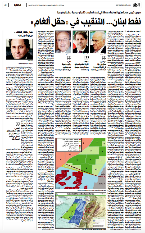 وهنا يشرح رئيس لجنة الأشغال والطاقة النائب محمد قباني لـ«الراي» عن أصل الخلاف الذي حصل اثناء المباحثات بين الوفدين اللبناني والقبرصي، «حيث اقتصر الوفد اللبناني على مهندسين اثنين فقط، بينما كان الوفد القبرصي يتألف من 8 اعضاء بينهم اثنان من كبار القانونيين في الحدود البحرية، وذلك العام 2007»، وقال: «في ذلك الوقت الوفد اللبناني كان ضعيفاً ووافق على أمور استُغلت لاحقا وأبرزها، النقطة الجنوبية في الخط الوسط، هي تحمل الرقم 23. وقبل الوصول الى الترسيم النهائي ارتؤي ان توضع نقطة رقمها واحد، فوضع الخط من نقطة واحد الى نقطة 6. واحد هي النقطة الموقتة بيننا وبين قبرص في الجنوب، و 6 هي النقطة الموقتة بين لبنان وقبرص من ناحية الشمال. وقضى الاتفاق بين لبنان وقبرص بمنع اي طرف من توقيع اي اتفاقية دون موافقة الطرف الثاني، فيما يتعلق بالنقطتين واحد وستة، لكن قبرص لم تلتزم ووقّعت اتفاقاً مع اسرائيل استعملوا فيه النقطة واحد بدل النقطة 23 باعتبارها نقطة ثلاثية بين لبنان وقبرص واسرائيل». وفيما يتعلق بالخط الفاصل بين لبنان واسرائيل، النقطة في البر محدَّدة وهي جنوب الناقورة، ويبقى الخلاف على النقطة في البحر، واسرائيل تدّعي ان هنالك مثلثاً بين النقطة 1 والنقطة 23 مساحته 865 كلم2. وبحسب قباني، فإن «لبنان يرفض هذه الكلام ويعتبر النقطة 23 هي الحد الفاصل، وهذا المثلث الذي تدّعيه اسرائيل هو جزء من المنطقة الاقتصادية الخالصة العائدة الى لبنان، وهنا تدخّلت اميركا بإجراء وساطة بين البلدين مؤكدة على حق لبنان بـ 55 بالمئة من هذه المنطقة فرفض الجانب اللبناني مصراً على المنطقة كلها اي الـ 865 كلم2». ويضيف قباني: «طلب لبنان من الامم المتحدة ترسيم الخط الازرق بين لبنان واسرائيل في البحر كما في البر ولكن الأمم رفضتْ لأن البحر ليس من مهماتها كما تقول، الا ان لبنان بقي متمسكاً بسقف القرار 1701 منتظراً قراراً مشابه للبحر تجنباً لاي نزاع مستقبلي حول ترسيم الحدود الجنوبية للمنطقة الاقتصادية الخالصة». كما نفى ما تردّد عن تسوية للبدء بالتنقيب في المنطقة الجنوبية المتنازع عليها مع اسرائيل على ان يتم وضْع المال في صندوق محايد ليوزَّع بين لبنان واسرائيل حال تسوية الخلاف، مشيراً الى «ان تقسيم البلوكات الى عشرة في المنطقة الاقتصادية الخالصة التابعة للبنان كان أفضل الممكن الذي أوصى به خبراء الجيولوجيا»، ولافتاً الى «ان لبنان سيبدأ في حال استدرج العروض للتنقيب بثلاثة بلوكات واحد منها في الجنوب لربْط نزاع مع اسرائيل حول أحقية لبنان بالنفط الموجود في تلك النقطة لانها داخل حدوده، علماً ان البدء بثلاث لا أكثر هدفه ان يكتسب لبنان قوة تفاوض تدريجية في استدراج العروض الانسب والتي تعود بالنفع على الدولة اللبنانية». وفيما يتعلق بالتقارير التي أشارت الى ان نفط لبنان أمام خياريْن إما الانضمام الى خط الغاز الاميركي – الاسرائيلي او انتظار الخط السوري – الروسي، يرى قباني «ان الأمر ليس بهذه السهولة اذ ان مخطط اسرائيل كان يقضي بنقل النفط من خلال خط من الداخل الاسرائيلي، وأنبوب آخر من مصر الى قبرص، ومن قبرص أنبوب يتجه الى اليونان ومنها الى اوروبا، وتبيّن بعد ذلك ان الخط بين قبرص واليونان غير واقعي وكبير الكلفة ولا جدوى اقتصادية منه، ولذلك الخيار الوحيد الآن هو ان يمر خط الغاز والنفط من خلال تركيا وهذا هو سبب الاجتماع الذي حصل قبل نحو شهرين على مستوى عالٍ بين رجب طيب اردوغان ونتنياهو وخلفية هذا الموضوع كانت الغاز والنفط قبل اي شيء آخر». اهتمام الدولة اللبنانية بالتنقيب عن النفط في البحر لم يلغِ الاهتمام بالتنقيب عن النفط في البر، فقد قدم قباني مشروع قانون يتعلق بذلك الى مجلس النواب قبل نحو شهر، في وقت يترقب المعنيون اذا كان اهتمام الشركات الكبرى بموضوع النفط اللبناني تراجع ام لا خصوصاً بعد ارتفاع تكلفة التنقيب والاستخراج عالمياً وتَراجُع أسعار النفط، علماً ان المعنيين يعوّلون على الوقت اذ ثمة احتمال بأن تتغيّر الأسعار في 