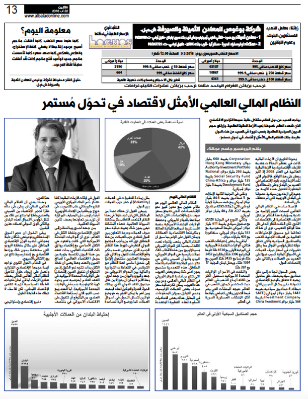 يُخبرنا التاريخ أن الأزمات المالية كانت في مُعظم الحالات مُقدمة للأزمات الإقتصادية، وما الأزمة المالية العالمية في العام ٢٠٠٨ إلا أكبر برهان على هذا الواقع. فالأعوام التي تلت الأزمة أبرزت ركود إقتصادي في العديد من البلدان وعلى رأسها الدول المُتطورة لتتحول هذه الأزمة من جديد إلى أزمة ديون سيادية خصوصًا في البلدان الأوروبية التي لم تتعافى حتى الساعة. الإصلاحات في النظام المالي العالمي أصبحت اليوم إلزامية من ناحية مسؤولية هذا النظام عن نقل الأزمات الإقتصادية إلى الإقتصادات الأخرى. لكن المُلفت للنظر أنه في ظل هذا الواقع التعيس، نرى أن هناك تعاظم غير مسبوق للإحتياطات العالمية من العملات الأجنبية، الذهب والصناديق السيادية والتي تخلق حركة تنقل لرؤوس الأموال مما يخلق تغييرات في أسعار صرف العملات في الأسواق المالية تُسبب ضررًا على العديد من العملات وبالتالي على إقتصادات الدول. بعض الدول إلتجأت إلى خلق صناديق سيادية بهدف خلق مداخيل ريعية لا تتعلق بالوضع الإقتصادي للدولة على مثال الصين التي تمتلك ٤ صناديق سيادية بقيمة ١٤٤١ مليار دولار أميركي (SAFE Investment Company بقيمة ٥٦٨ مليار دولار، China Investment Corporation بقيمة ٤٤٠ مليار دولار، Hong Kong Monetary Authority Investment Portfolio بقيمة ٢٩٣ مليار دولار، National Social Security Fund بقيمة ١٣٥ مليار دولار، و China-Africa Development Fund بقيمة ٥ مليار دولار أميركي). وتأتي في المرتبة الثانية الإمارات مع ٥ صناديق بقيمة ٨٠٤ مليار دولار أميركي مع شبه سيطرة لإمارة أبو ظبي التي تمتلك ثلاثة صناديق بقيمة ٦٢٧، ٥٨، و٤٨ مليار دولار أميركي. وتأتي النروج في المرتبة الثالثة مع صندوق سيادي بقيمة ٦١١ مليار دولار أميركي تليها السعودية مع ٥٣٣ مليار دولار أميركي، سنغافورة مع ٤٠٥ مليار دولار…