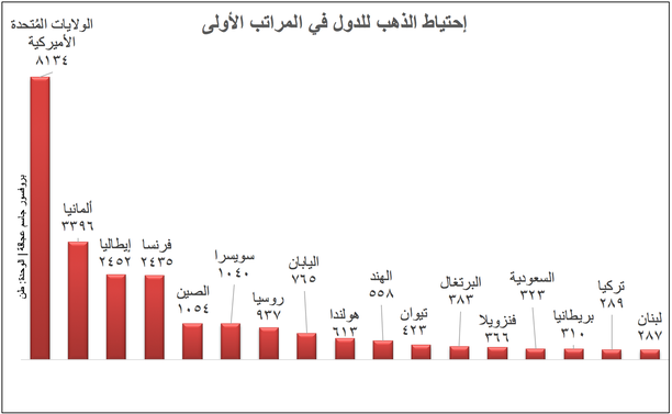 أما في ما يخصّ إحتياطات الذهب فتأتي الولايات المُتحدّة الأميركية في المرتبة الأولى مع ٨١٣٤ طنّ تليها ألمانيا مع ٣٣٩٦ طنّ، إيطاليا مع ٢٤٥٢ طنّ، فرنسا مع ٢٤٣٥ طنّ، الصين مع ١٠٥٤ طنّ… ويحتل لبنان المرتبة ١٧ مع ٢٨٧ طنّ. والمُلفت في الأمر أن الولايات المُتحدة الأميركية تستقبل أكثر من ثلاثة أرباع الذهب في العالم حيث تُستخدم كمخزن للذهب في العالم نتيجة المنشأت التي يتم فيها التخزين والتي تُضاهي بأمانها أكثر المُنشأت العسكرية السرية في العالم.
