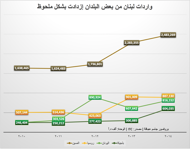 أما على صعيد الإستيراد، فنرى أن تعلق لبنان ببعض الدول كبير ويزداد مع الوقت بشكل ملحوظ. فالإستيراد من الصين إرتفع منذ العام 2010 من 1.6 مليار دولار، إلى أكثر من 2.4 مليار دولار في العام 2014، أي الضعف تقريباً في أقل من 4 أعوام. وبالنظر إلى نوع البضائع التي يستوردها لبنان من الصين، نرى أن الحديد والفولاذ يأتي على رأس الإستيراد مع زيادة من 282 مليون دولار في العام 2013 إلى 519 مليون دولار في العام 2014. وهذه الزيادة لا يُمكن تبريرها بزيادة الطلب وحده، فزيادة السعر تأتي بالدرجة الأولى. ولم يتمّ أخذ أي إجراء على هذا الصعيد من جانب الدولة اللبنانية لإمتصاص قسم من هذا الإرتفاع في الأسعار عبر إيجاد مصادر إخرى من بلدان أفريقية أو جنوب أسيوية أو حتى من روسيا. فمع إنخفاض الروبل الروسي، تُشكّل هذه الأخيرة مصدر جذب للإستيراد . من هنا نستنتج أن ضعف الإستثمارات ليس الوحيد المسؤول عن العجز في الميزان التجاري، بل هناك تقاعس من قبل السلطات في إتخاذ الإجراءات المناسبة في ما يخص ترشيد الإستيراد وتحفيز التصدير وتنويع إتجاهاته.