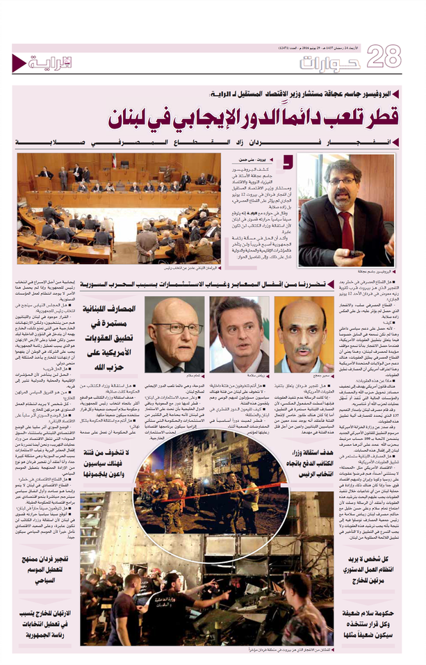 ماذا عن هذه العقوبات؟ هناك قانون أمريكي يهدف إلى تجفيف مصادر تمويل حزب الله والمصارف والمؤسسات المالية التي تُنفذ أو تُسهّل عمليات لحزب الله أو مُناصريه.وقد قام مصرف لبنان بإصدار التعميم 137 الذي يُحدد للمصارف آلية تطبيق هذه العقوبات.وقد صدر عن وزارة الخزانة الأميركية مرسوم التطبيق للقانون الأميركي الجديد يتضمن لائحة بـ 100 حساب مرتبط بـحزب الله عمد على أثرها مصرف لبنان إلى إقفال هذه الحسابات. هل المصارف اللبنانية ستستمر في تطبيق العقوبات الأمريكية؟ الاقتصاد الأمريكي مثل “المحدلة” لا يستثني أحداً، هم فرضوا عقوبات على روسيا وكوبا وإيران ولديهم اقتصاد قوي جداً وإذا كان هناك ذكاء وإرادة في حماية لبنان من أي تداعيات خلال تنفيذ العقوبات يجب عليهم البحث بترشيد هذه العقوبات وأعتقد أن الرسالة وصلت لأن اجتماع تمام سلام وعلي حسن خليل مع حاكم مصرف لبنان رياض سلامة مع رئيس جمعية المصارف توصلوا فيه إلى نتيجة بأنه يجب ترشيد هذه العقوبات ولا يجب التسرع في التطبيق ولا التأخير في تطبيق اللائحة المطلوبة من لبنان. هل تفجير فردان يتعلق بتنفيذ العقوبات الأمريكية؟ إذا كانت الرسالة عدم تنفيذ العقوبات فإنها أعطت المفعول العكسي، لأن المصارف اللبنانية مستمرة في التطبيق، أما إذا كان هناك طابور خامس لإشعال الفتنة فأعتقد أنه يوجد عدد معين من السياسيين اللبنانيين واعين من أجل قتل هذه الفتنة في مهدها. هل أنتم تتخوفون من فتنة داخلية؟ لا نتخوف على لبنان من فتنة فهناك سياسيون مسؤولون لديهم الوعي وهم يلجّمون هذه الفتنة. كيف تقيمون الدور القطري في لبنان والمنطقة؟ قطر لعبت دوراً أساسياً في المفاوضات الصعبة أثناء رعايتها لمؤتمر الدوحة، وهي دائما تلعب الدور الإيجابي لصالح لبنان. وعلى صعيد الاستثمارات في لبنان؟قطر لديها دور مع السعودية وباقي الدول الخليجية بأن تحث على الاستثمار في لبنان لأنه بحاجة إلى الكثير من الاستثمارات والحكومة التي ستأتي إلزاميا سيكون برنامجها اقتصادياً لجذب الاستثمارات الخارجية. هل استقالة وزراء الكتائب من الحكومة كانت صائبة؟ هدف استقالة وزراء الكتائب هو الدفع أكثر باتجاه انتخاب رئيس للجمهورية، وحكومة سلام أصبحت ضعيفة وكل قرار ستتخذه سيكون ضعيفاً مثلها. هل أنتم مع استقالة الحكومة بشكل نهائي؟ على الحكومة أن تعمل على صدمة إيجابية من أجل الإسراع في انتخاب رئيس للجمهورية وإذا لم يحصل هذا الأمر لا يوجد انتظام لعمل المؤسسات الدستورية.