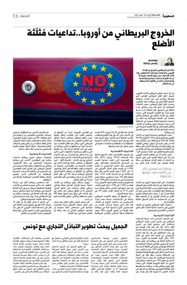 هكذا قرّر البريطانيون الخروج من الإتحاد الأوروبي و»إستعادة سيادتهم» كما يقولون. وإذا كانت التداعيات على سوق العملات فورية، إلا أن هذا القرار له تداعيات سياسية وإقتصادية وإجتماعية لن تتأخر في الظهور كما سيظهر في هذا المقال. من أبرز أسباب الرفض البريطاني للاتحاد الأوروبي تحميل الرأي العام البريطاني القوانين التي تفرضها بروكسل على دول الإتحاد مسؤولية التراجع الاقتصادي في بريطانيا. هذه القوانين، وبحسب الرأي العام البريطاني، منعت الشركات البريطانية من النمو كما يجب وبالتالي زادت البطالة في المجتمع. هذه البطالة زادت بنسبة كبيرة أيضاً مع القوانين الأوروبية التي سمحت لعمّال دول الإتحاد بالعمل في بريطانيا وبالتالي منافسة اليد العاملة البريطانية وما لذلك من تداعيات إجتماعية هائلة خصوصاً في المناطق التي صوتت لمصلحة خروج بريطانيا من الإتحاد. وتفاقم الوضع أكثر مع أزمة الهجرة السورية التي عصفت بأوروبا مع حلم كل مهاجر سوري بالوصول إلى بريطانيا. صوّت البريطانيون لمصلحة الخروج من الإتحاد الأوروبي ولو بفارق ضئيل (51.9% للخروج و48.1% للبقاء). هذا الأمر أصبح واقعاً يجب التعامل معه لأنه لن يكون بقدرة أي مسؤول بريطاني الوقوف في وجهه بحكم أنه يُمثل قرار الشعب أعلى سلطة في الأنظمة الديمقراطية حتى ولو كان هناك من مخارج قانونية للطعن فيه. فماذا سيحصل الأن؟ تنص المادة 50 من معاهدة الإتحاد الأوروبي على أنه على الدولة العضو التي تنوي الخروج من الإتحاد، أن تُعلم الإتحاد برغبتها في رسالة خطية وتفرض على الإتحاد فترة عامين من المُفاوضات على آلية وشروط الخروج من الإتحاد مع هذه الدولة. على إثر هذه الفترة يقوم الفريقان بتنفيذ شروط الخروج بحسب الآلية والشروط التي تمّ وضعها خلال المفاوضات. هذا يعني عملياً أن هناك فترة 5 إلى 7 سنوات أمام بريطانيا للخروج الكلّي من الإتحاد الأوروبي أي أن العملية فيها نوع من الإستمرارية بما يُلائم الأسواق المالية والإقتصادية. تداعيات القرار البريطاني بالخروج من الإتحاد الأوروبي هي تداعيات ثلاثية الأبعاد تطال الشق السياسي، الاقتصادي والإجتماعي. التداعيات السياسيةعلى الصعيد السياسي، أدّت نتيجة الإستفتاء البريطاني إلى تقديم رئيس الوزراء البريطاني إستقالته التي ستصبج نافذة في تشرين الأول 2016. وإذا كان هذا الأمر طبيعيا في الديمقراطيات، إلا أنه تاريخياً كان هناك إنقسام في حزب المحافظين في كل مرّة فقد الجنيه الإسترليني من قيمته كما حصل في العام 1931 خلال الأزمة الاقتصادية الكبرى، حيث أدّت الأزمة المالية في بريطانيا إلى خفض قيمة الجنيه الإسترليني وبالتالي إضطرّت الحكومة إلى الإستقالة مع فوضى كبيرة في الطبقة السياسية. كذلك الأمر في العام 1967، حيث إنخفض سعر صرف الجنيه بشكل كبير دفع بالحكومة البريطانية إلى الإستقالة ونتجت عنها هزّة في الحياة السياسية البريطانية. ولا يُمكن نسيان الأربعاء الأسود في العام 1992 حين أضطرّت بريطانيا إلى الخروج من الآلية الأوروبية للفوائد التي سبقت خلق اليورو وبالتالي فقدت بريطانيا مصداقيتها أمام نظرائها الأوروبيين ومنعتها من الدخول إلى الإتحاد النقدي. أما أوروبياً فقد قرّر رؤساء دول الإتحاد عقد قمّة في 28 و29 حزيران 2016 للبحث في الأسباب التي آلت إلى هذا الوضع والخطوات الواجب إتخاذها لدعم الإتحاد، ومنع حصول هذا الأمر مع دول أخرى خصوصاً أن الأحزاب اليمينية المُتطرّفة بدأت بالمُطالبة بإستفتاءات شعبية في بعض الدول مثل فرنسا وغيرها. التداعيات الاقتصاديةعلى الصعيد الاقتصادي، عاشت الأسواق المالية ليلة الإستفتاء (23-24 حزيران 2016) حالة من الهستيريا التي رافقت مضاربة العديد من الصناديق الإستثمارية والمصارف. وفي التفاصيل، فقد الجنيه الإسترليني ما يقارب 0.1359 من قيمته مقابل الدولار الأميركي (من 1.5 إلى 1.3641 دولار للجنيه الواحد خلال ليلة الإستفتاء) أي أن الخسارة كانت 13.59 دولارا أميركيا لكل 100 جنيه إسترليني.