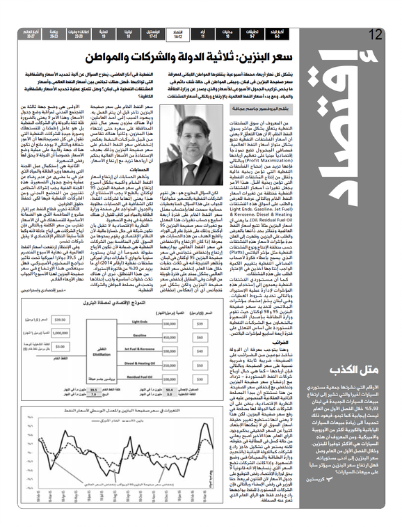 يُشكل كل نهار أربعاء محطة أسبوعية ينتظرها المواطن اللبناني لمعرفة سعر صفيحة البنزين في لبنان، ويبقى المواطن في حالة شك دائم في ما يخص تركيب الجدول الأسبوعي للأسعار والذي يصدر عن وزارة الطاقة والمياه. ومع بدء أسعار النفط العالمية بالإرتفاع وبالتالي أسعار المشتقات النفطية في أذار الماضي، يُطرح السؤال عن آلية تحديد الأسعار والشفافية التي تواكبها. فهل هناك تجانس بين أسعار النفط العالمي وأسعار المشتقات النفطية في لبنان؟ وهل تتمتع عملية تحديد الأسعار بالشفافية الكافية؟ من المعروف أن سوق المشتقات النفطية يتعلّق بشكل مباشر بسوق النفط الخام، إلا أن هذا التعلّق لا يعني أن أسعار المُشتقات النفطية تتبع بشكل متوازي أسعار النفط العالمية. فمصافي البترول تتبع نموذجاً إقتصادياً مبني على تعظيم أرباحها (Profit Maximization) وبالتالي فإنها تزيد من إنتاج المُشتقات النفطية التي تؤمن ربحية عالية وتُقلل من إنتاج المُشتقات النفطية التي تؤمن ربحية أقلّ. هذا الأمر يجعل تغيرات أسعار المُشتقات النفطية مُختلفة عن تغيرات أسعار النفط الخام وبالتالي عرضة للعرض والطلب على أسواق هذه المُشتقات (Light Ends، Gasoline، Jet Fuel & Kerosene، Diesel & Heating Oil، Residual Fuel Oil). ما يعني إن أسعار البنزين مثلاً تتبع أسعار النفط العالمية وتتأثر بحد ذاتها بالعرض والطلب على البنزين. وظهرت إلى العلن عدة مؤشرات لأسعار هذه المُشتقات بحسب منطقة الإنتاج ونوع المُشتقات النفطية مثل مؤشر البلاتس (Platts) الذي يسمح بإعطاء فكرة لأصحاب المصافي النفطية بتقييم الكمية الواجب إنتاجها أخذين بعين الإعتبار الطلب على هذه المُشتقات. كما أن مستوردي المُشتقات النفطية يعمدون إلى إستخدام هذه المؤشرات لإدارة عملية الإستيراد وبالتالي تحديد شروط العمليات. وفي لبنان يتمّ إعتماد مؤشرات البلاتس لتحديد سعر صفيحة البنزين 95 و98 أوكتان حيث تقوم وزارة الطاقة بإصدار التسعيرة بالتعاون مع الشركات النفطية المُستوردة على أساس المُعدّل على فترة أربعة أسابيع لمؤشرات البلاتس. وهنا يتوجب معرفة أن الدولة تأخذ نوعين من الضرائب على الصفيحة: ضريبية ثابتة وضريبة نسبية على سعر الصفيحة. وبالتالي فإن أرباحها – كما هي حال أرباح شركات النفط المُستوردة – تزداد مع إرتفاع سعر صفيحة البنزبن وتنخفض مع إنخفاض سعر الصفيحة.من هنا نستنتج أن مبدأ المصلحة الذاتية العقلانية المنصوص عليه في النظرية الإقتصادية، ينصّ على أن الشركات كما الدولة لها مصلحة في رفع سعر صفيحة البنزين. لكن هذا لا يعني أنها تستطيع تغيير حقيقة أسعار السوق أي لا يُمكنها الإبتعاد كثيراً عن السعر الحقيقي بحكم وجود الرأي العام. هذا الأخير أصبح يعاني من حالة كسل في المطالبة في حقوقه، لكنه يستمر في تشكيل حاجز رادع للشركات كما للدولة اللبنانية (بالتحديد وزارة الطاقة والمياه) في وضع التسعيرة. وإذا كانت الشركات تضع السعر الذي يُنسابها إلا أنه قانونياً لا يحق لوزارة الإقتصاد رفض التوقيع على جدول الأسعار لأن القانون لم يعطي حق للوزير في رفض الإمضاء وبالتالي فإن الشركات المُستوردة للنفط يواجها رادع واحد فقط هو الرأي العام الذي تُعبّر عنه الصحافة. لكن السؤال المطروح هو : هل تقوم الشركات النفطية بالتسعير عشوائياً؟ للجواب على هذا السؤال، قمنا بعمليات حسابية سمحت لها بإحتساب معدّل سعر النفط الخام على فترة أربعة أسابيع وحساب تغيرات هذا لمعدل مع تغيرات سعر صفيحة البنزين 95 أوكتان وذلك على فترة عام إلى الوراء. بالطبع الهدف من هذه الحسابات هو معرفة إذا كان الإرتفاع والإنخفاض في سعر النفط العالمي يوازيه إرتفاع وإنخفاض مُتجانس في سعر صفيحة البنزين 95 أوكتان في لبنان. وتُظهر النتيجة أنه في ثلاثة حقبات خلال هذا العام، إنخفض سعر النفط العالمي بشكل ممتد على فترة طويلة من الوقت وفي المقابل إنخفض سعر صفيحة البنزين ولكن بشكر غير مُتجانس أي أن إنعكاس إنخفاض سعر النفط الخام على سعر صفيحة البنزين تأخر قبل أن يتمّ العمل به. ويعود السبب إلى أحد ا