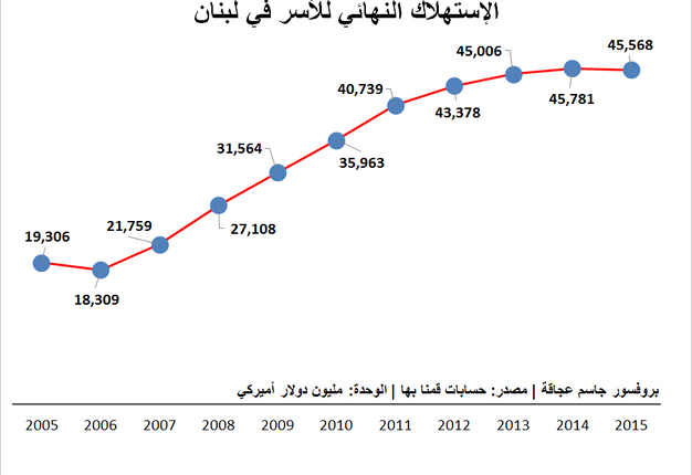 يُشكّل الإستهلاك النهائي للأسر في لبنان المُحرّك الأساسي للدورة الإقتصادية مع تخطيه عتبة الـ 100% من الناتج المحلّي الإجمالي في الأعوام المُمتدّة من 2011 إلى 2014. ويبقى السؤال الأساسي عن مصدر تمويل هذا الإستهلاك وكيفية تخطيه مدخول اللبناني. .يُشكّل الإستهلاك النهائي للأسر أحد العامودين الأساسيين الذين يقوم عليهما الإقتصاد. وإذا كان الإستثمار – العمود الثاني – قد تراجع في لبنان بشكل كبير منذ بدء الأزمة السورية إلا أن الإستهلاك النهائي زاد بشكل ملحوظ كما تُثبته أرقامنا. وقد شكّل هذا الإستهلاك محركاً أساسياً في النشاط الإقتصادي من ناحية أن حجمه الذي يفوق الـ 90% من الناتج المحلّي الإجمالي وتخطيه هذا الأخير في الأعوام 2011 إلى 2014 شكّل المحرك الأساسي وشبه الوحيد للناتج المحلّي الإجمالي الجدير بالذكر أنه لا يوجد أرقام للإستهلاك النهائي للأسر في لبنان، لذا عمدنا إلى حساب هذه الأرقام من مكونات الناتج المحلّي الإجمالي حيث يُظهر الرسم الأرقام التي إستحصلنا عليها. ويحق للقارئ أن يتساءل عن واقعية هذه الأرقام التي تفوق الناتج المحلّي الإجمالي؟ وهنا لابد من التذكير أن الإقتصاد الأميركي هو إقتصاد إستهلاكي بإمتياز مع إستهلاك يبلغ أكثر من 75% من الناتج المحلّي الإجمالي. وهذا لا يعني أن الإقتصاد اللبناني هو إقتصاد مُتطور لا بل على العكس ففي بعض البلدان التي تُعاني من ضعف إقتصادي كبير كأفغانستان، يبلغ الإستهلاك 109% من الناتج المحلّي الإجمالي. وهذا يعني بكل بساطة أن الإستثمار يُعاني من نقص كبير إلى درجة أنه لا يُساهم تقريباً إلا بنسبة ضئيلة جداً في الناتج المحلّي الإجمالي. في حين أنه في الولايات المُتحدة الأميركية، هناك شبه إشباع للإستثمار في الماكينة الإقتصادية وبالتالي فإن ثمرة هذه الإستثمارات تُقطف في الإستهلاك.الإستهلاك النهائي للأسر يضمّ إستهلاك المنتجات المُعمّرة، الألبسة، الطعام، الخدمات وغيرها. وعادة يتمّ تمويل هذا الإستهلاك من الأجور ومن الإقتراض. وتُشكّل زيادة الأجور عاملاً طبيعياً لزيادة الإستهلاك في حين أن الإقتراض هو وسيلة تستخدمها الحكومات في سياساتها الإقتصادية بهدف تحفيز الإستهلاك النهائي عبر تسهيل الحصول على قروض إستهلاكية. أما في لبنان فيعود تمويل الإستهلاك النهائي إلى عدة مصادر: